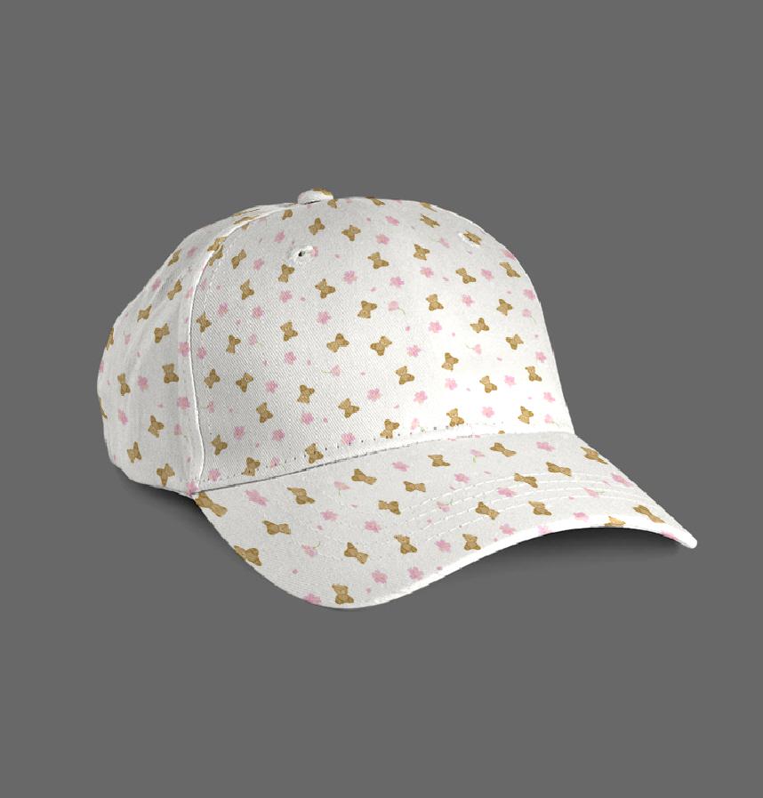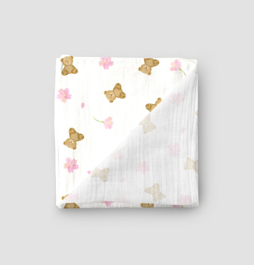 A soft pattern of teddy bears and cherry blossoms.