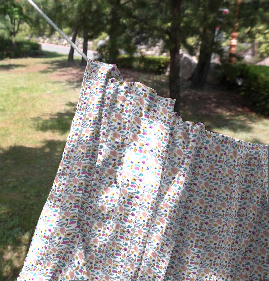 | Design infomation | Various leaves of the rainforest are expressed in unrealistic colors, patterned, and printed on the fabric |