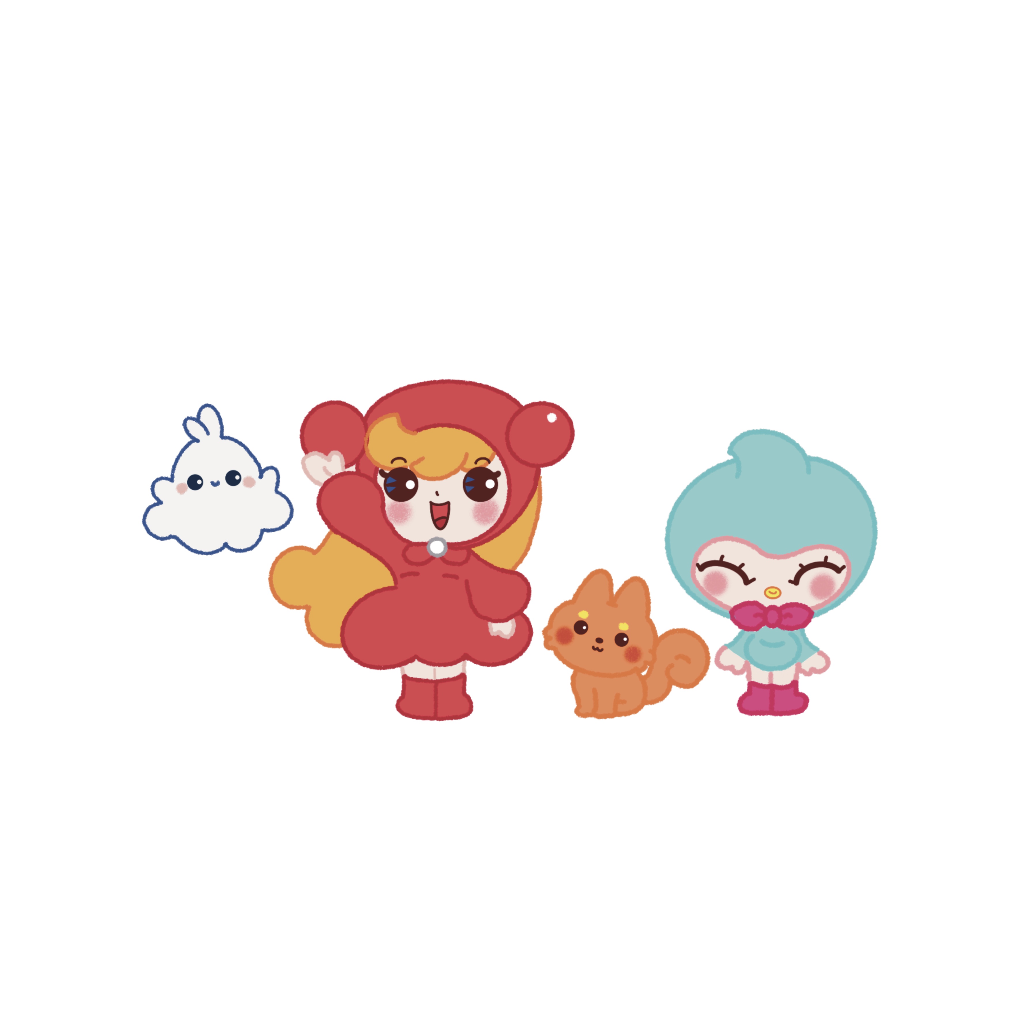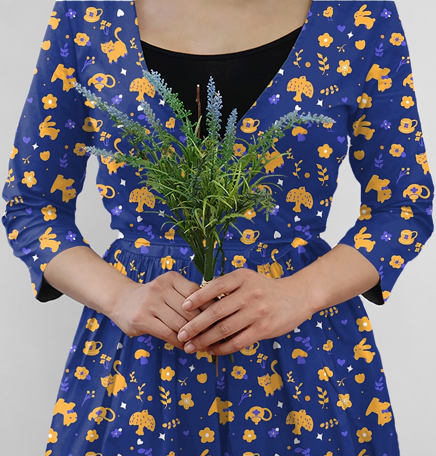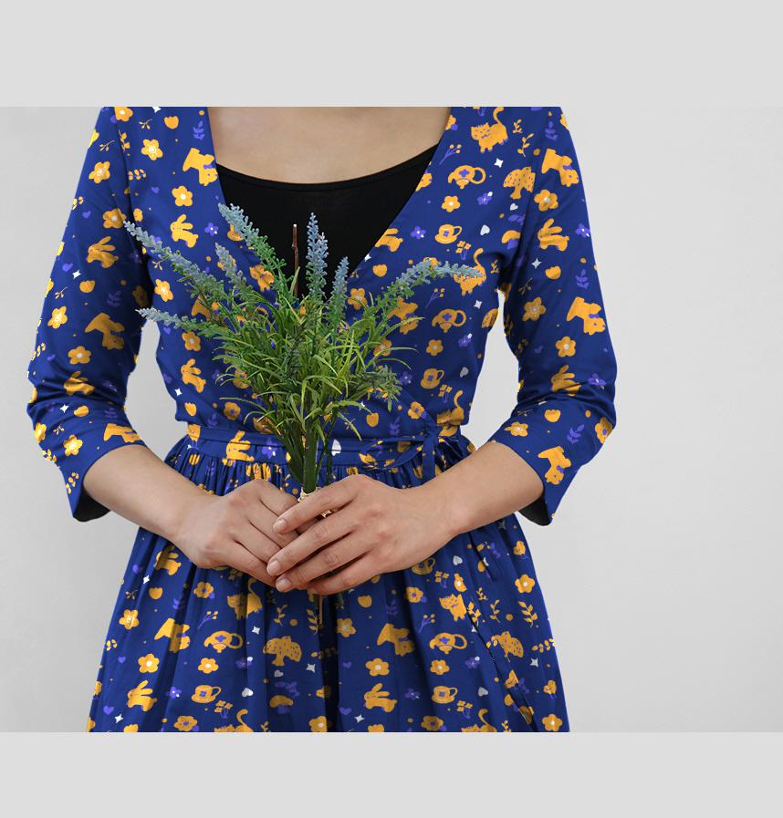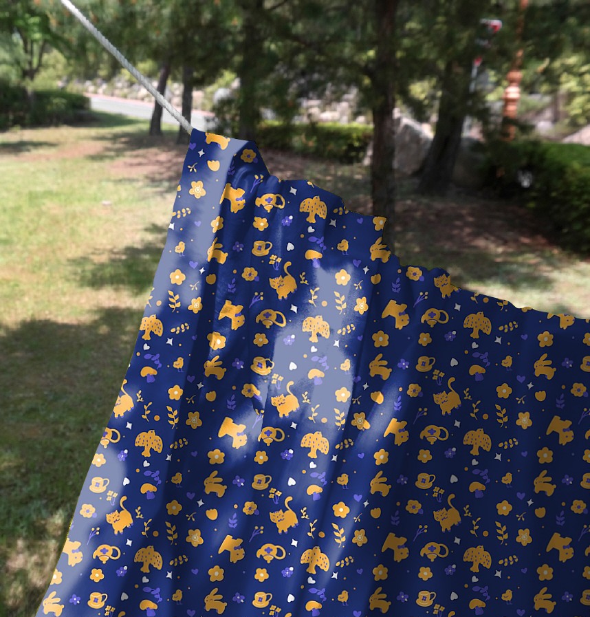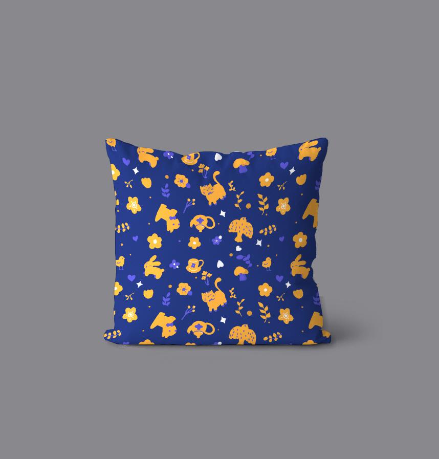 A Nordic style design of nature, flowers, puppies, cats, birds, etc. with a dark blue background.