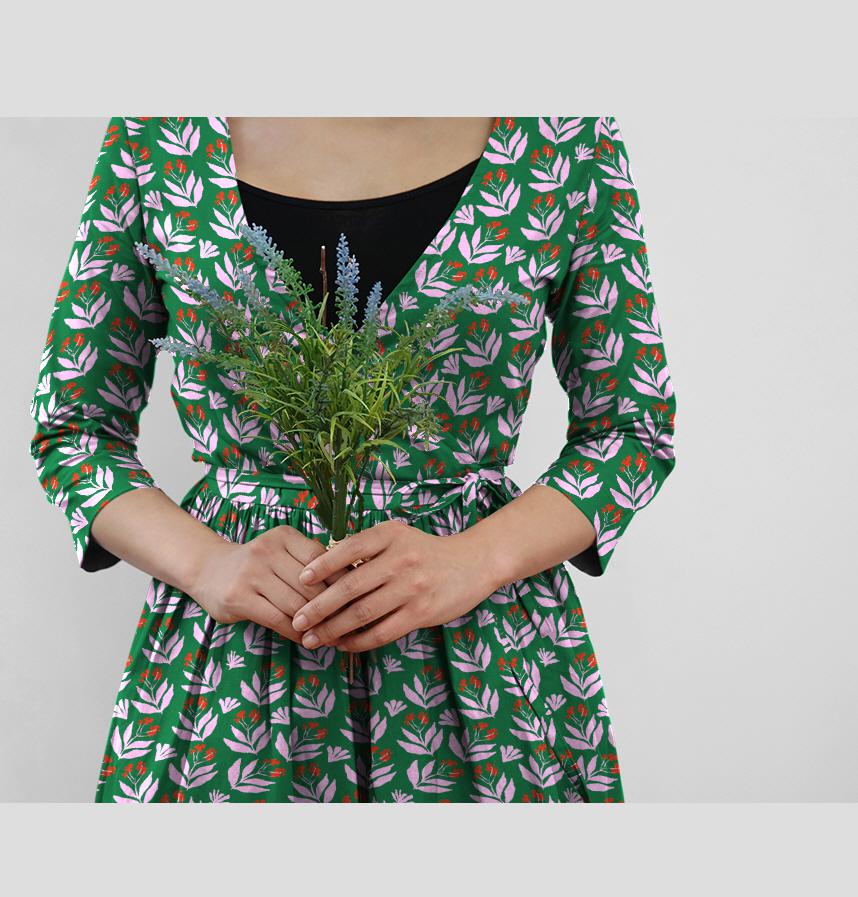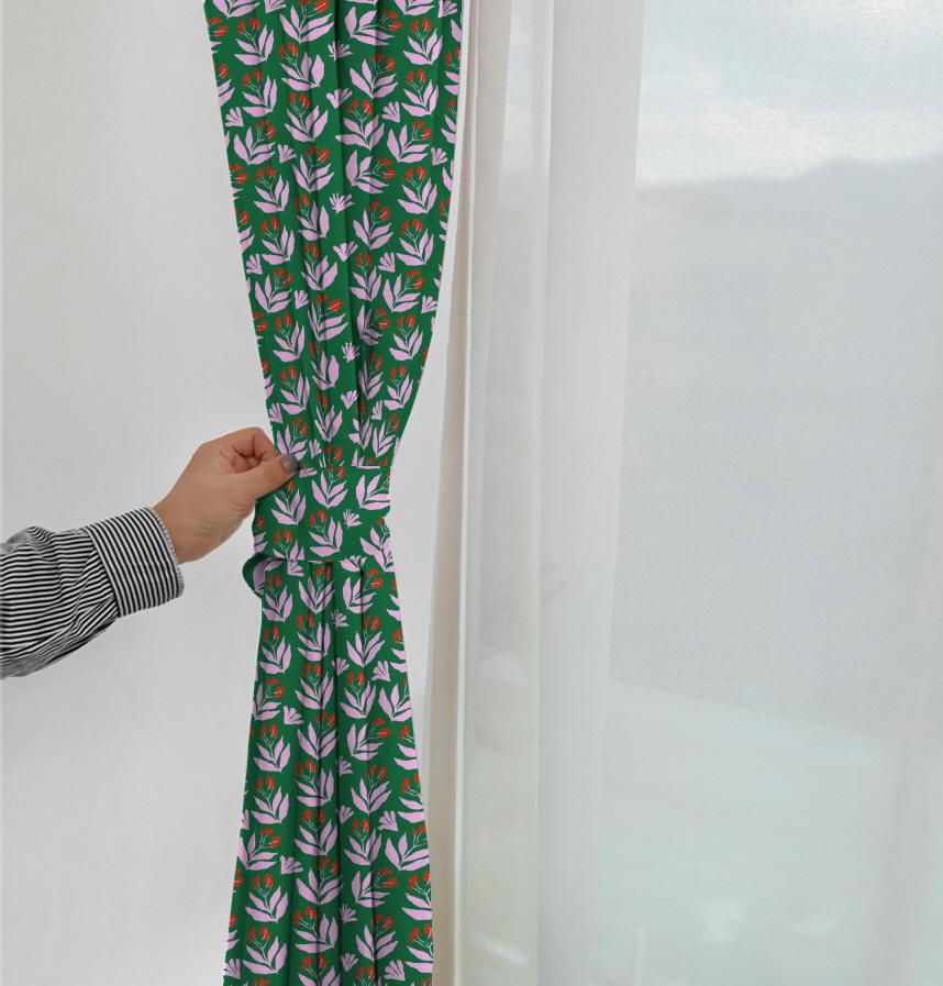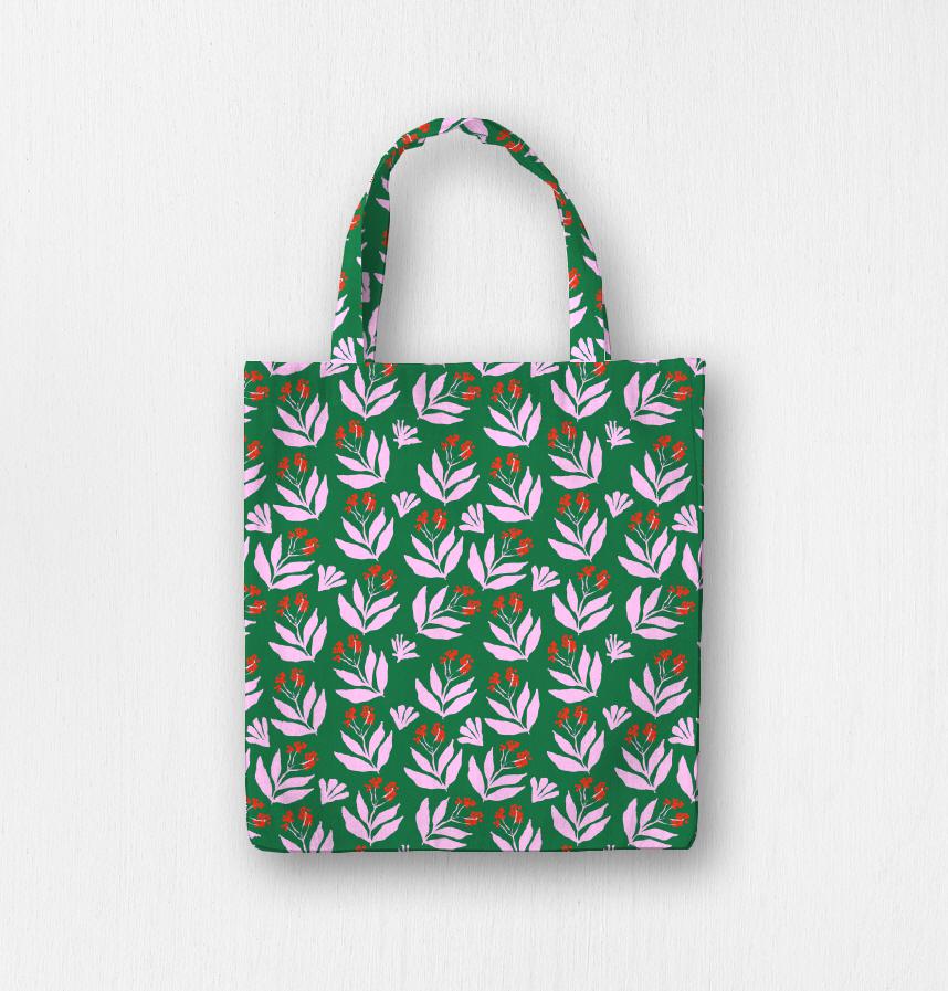 It is an intense and sophisticated pattern with pink leaves and red fruits on a green background, expressing the vitality of nature.