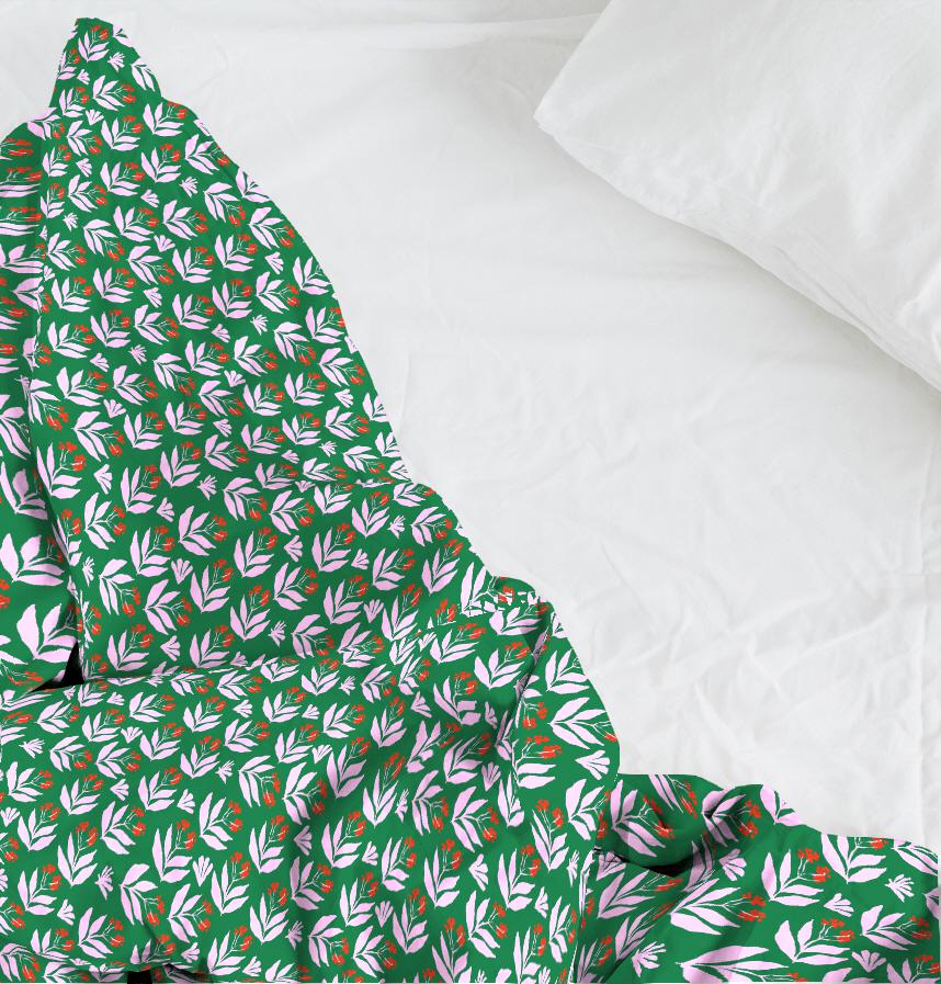 A bold yet sophisticated pattern of pink leaves and red berries on a green background, expressing the vitality of nature.
