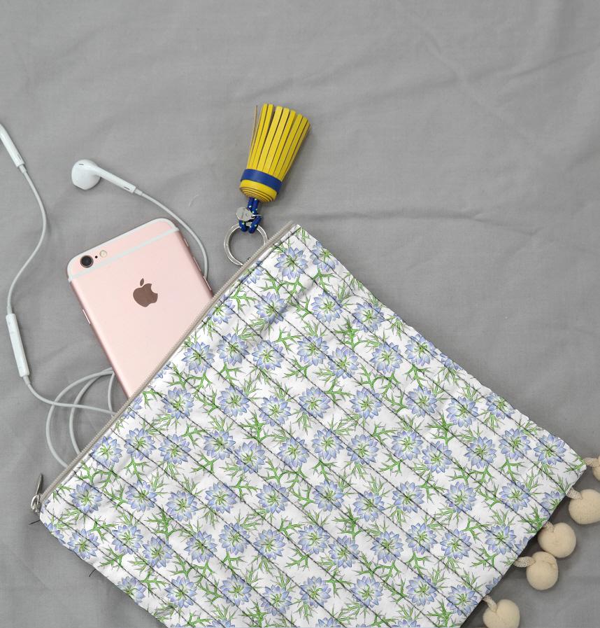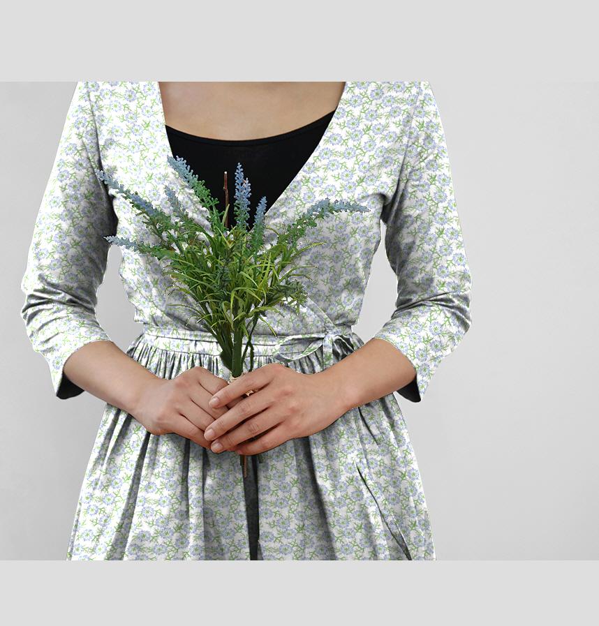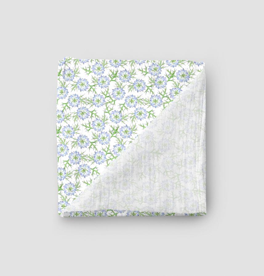 This Nigella design was created by scanning an analog illustration, then colourising and patterning it.
