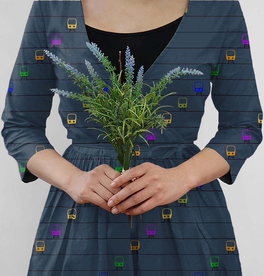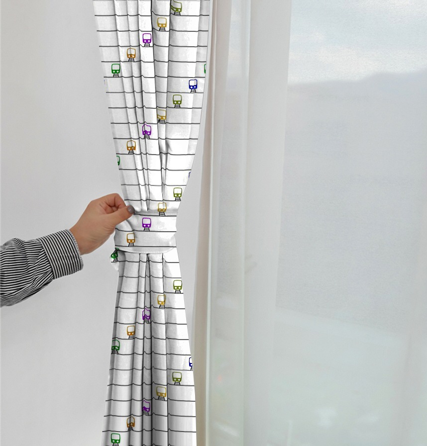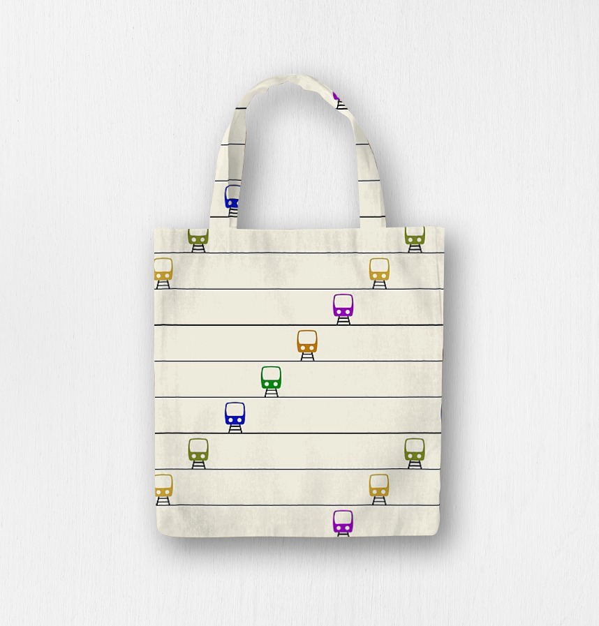 This design is a visual pattern inspired by subway maps , with colorful train icons arranged in a regular pattern on horizontal tracks. Each color symbolizes a different route or flow, and the repetition of simple lines and icons simultaneously expresses order and movement .