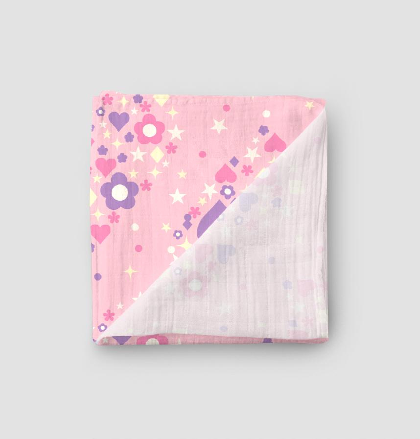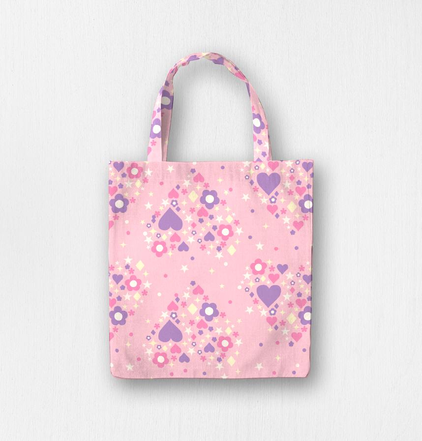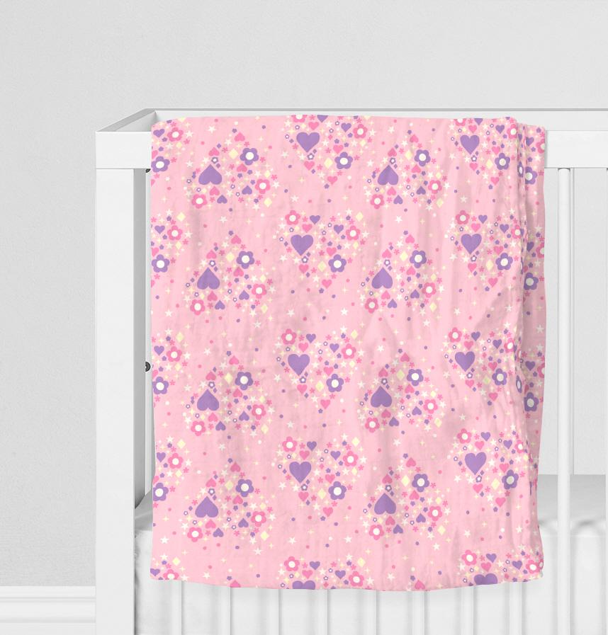 It has a cute heart pattern. The design is made up of hearts, stars, and glitter, all in the shape of a heart.
