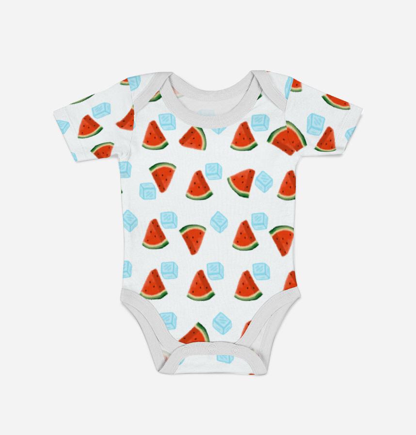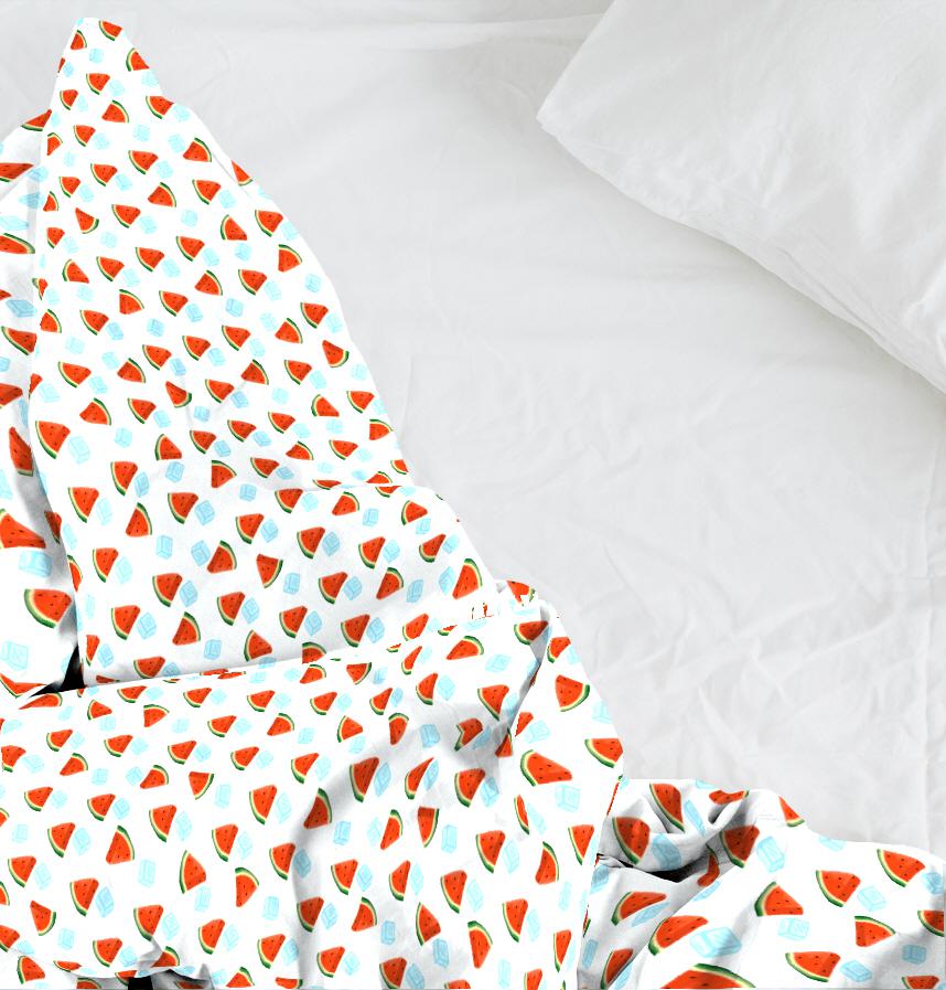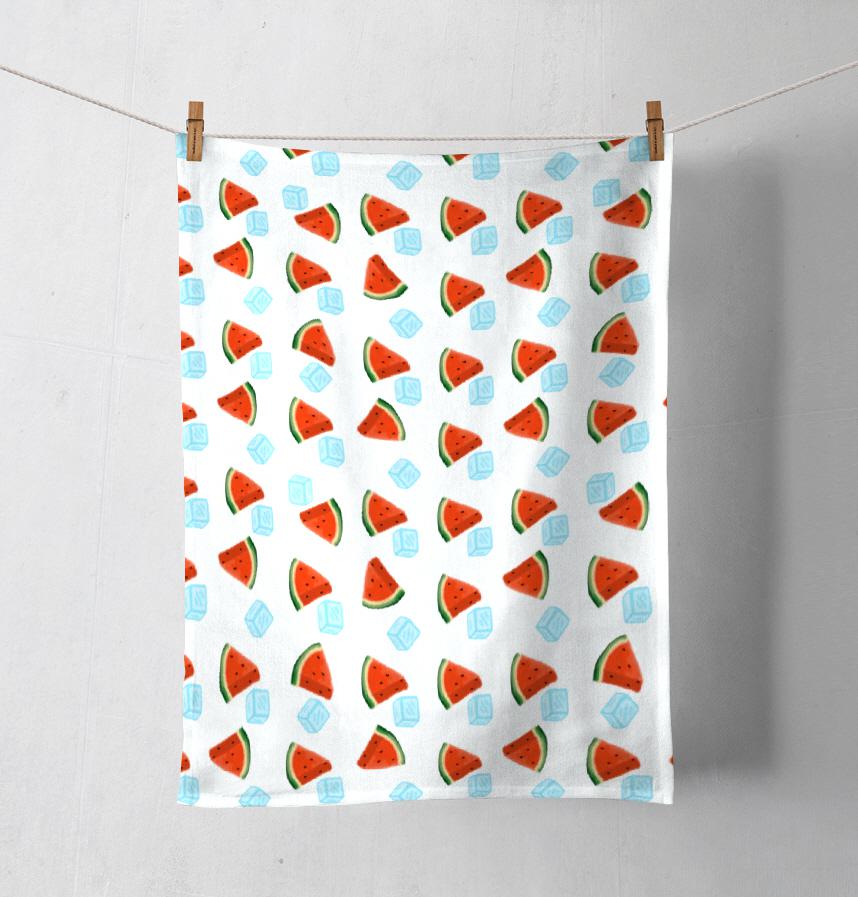 This design is a pattern that harmoniously arranges watermelon slices and ice cubes to express the coolness and joy of summer. The vivid colors of red, green, and blue visually convey coolness and vitality.