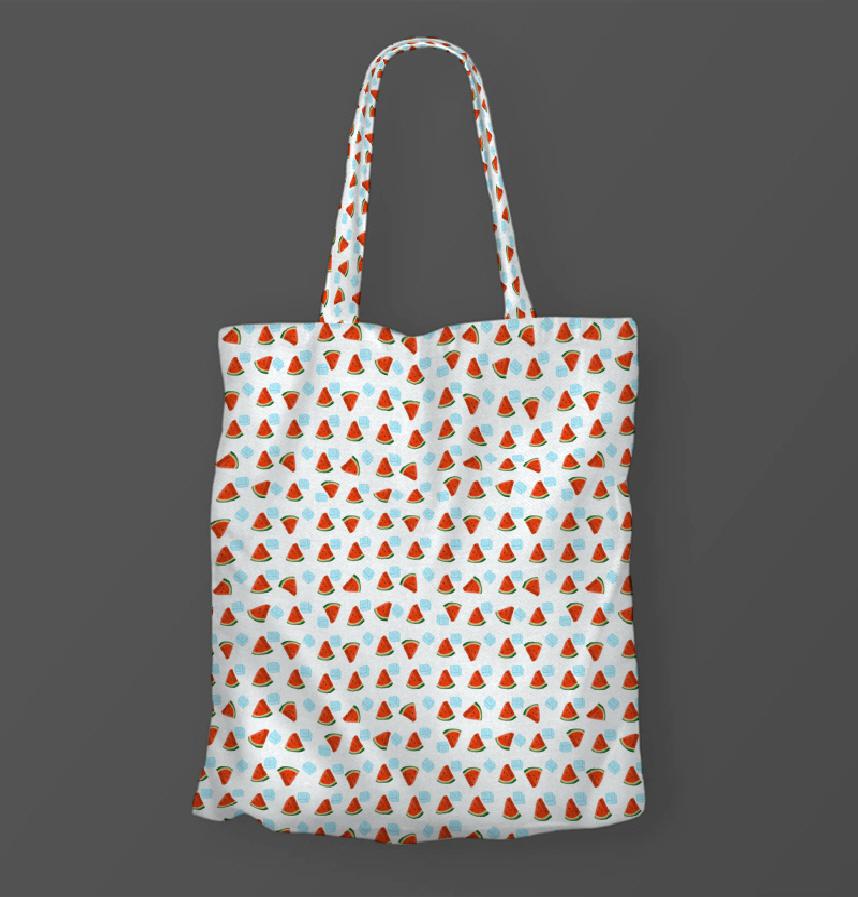 Design infomation | This design is a pattern with a harmonious arrangement of watermelon pieces and ice cubes to express the coolness and joy of summer. The vivid colors of red, green, and blue convey visual coolness and vitality. |