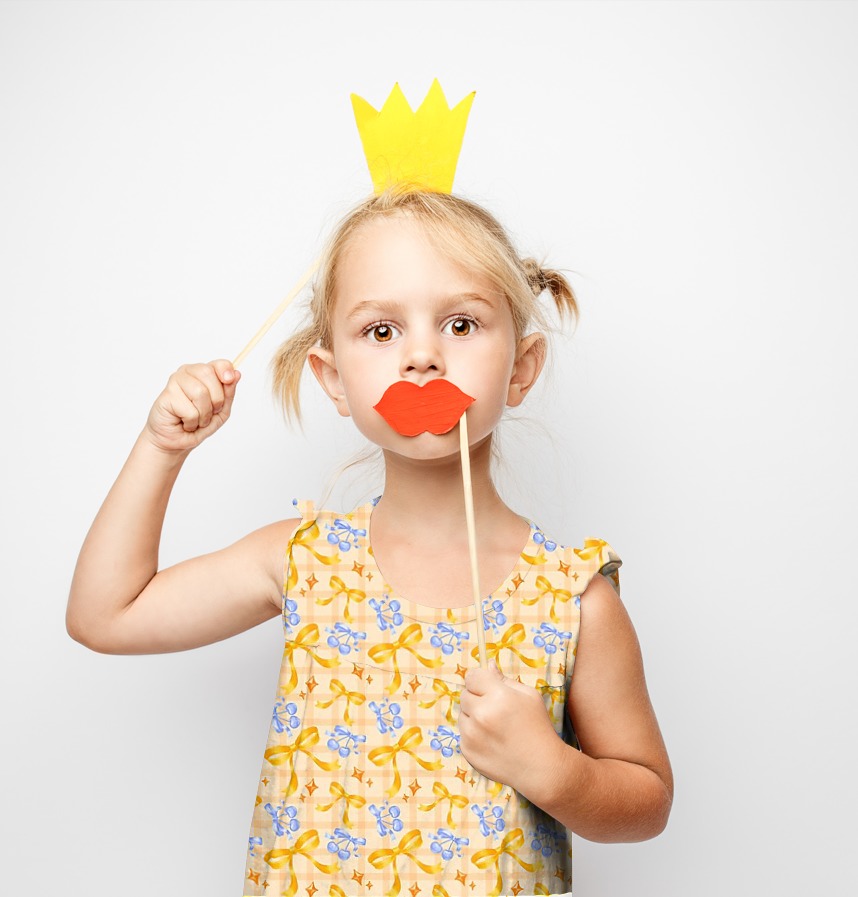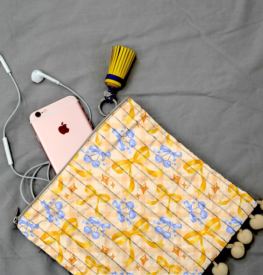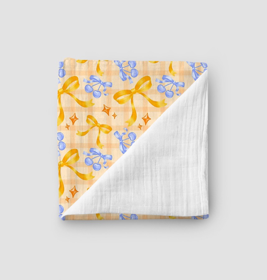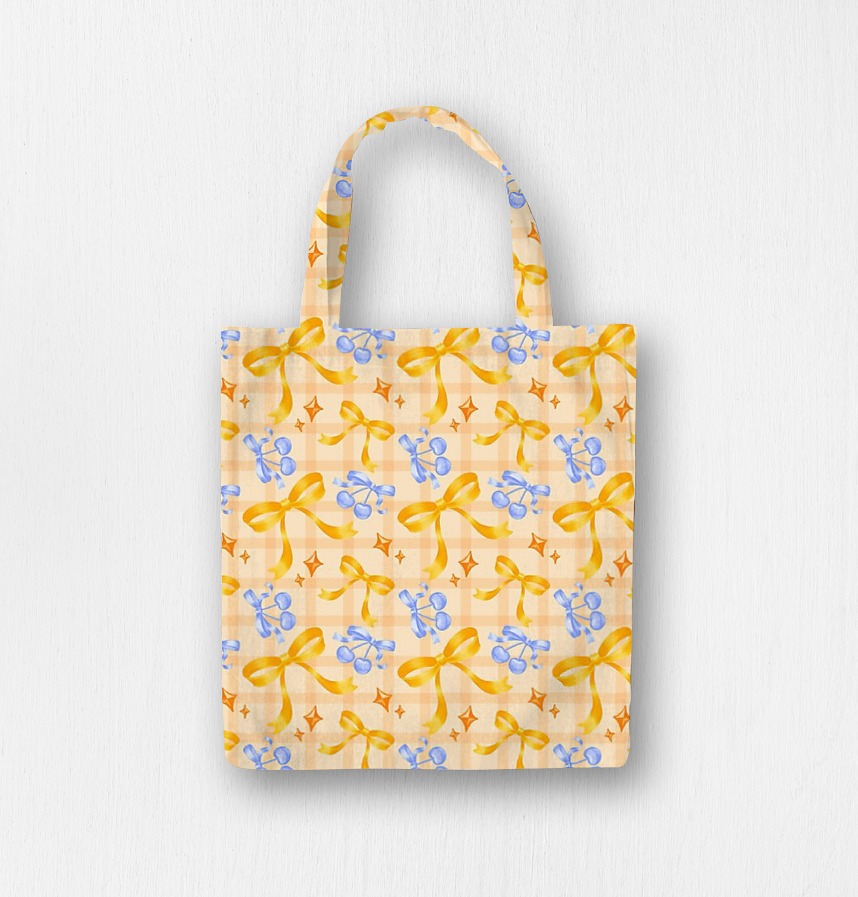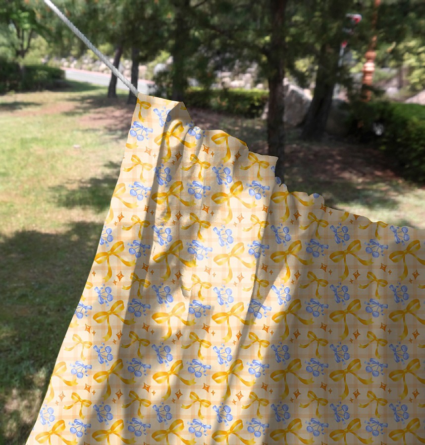 It is a shiny check pattern with a yellow ribbon and sky blue cherry that feels like a hand painting.