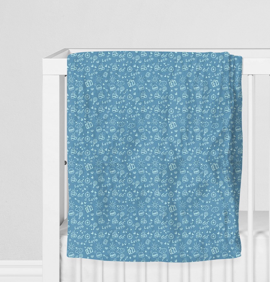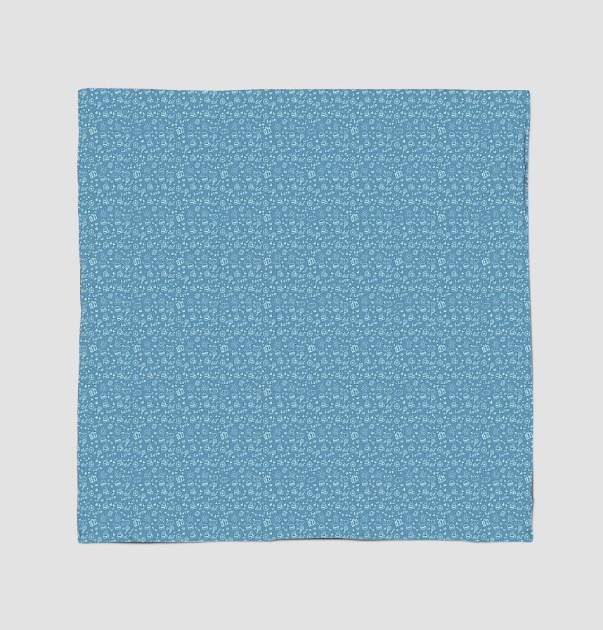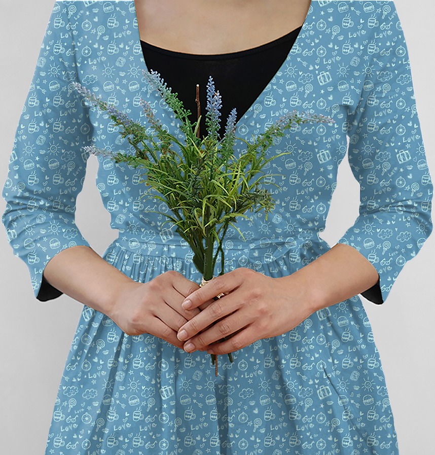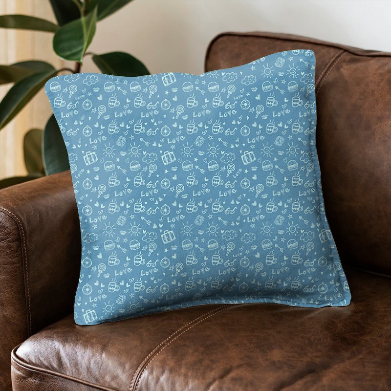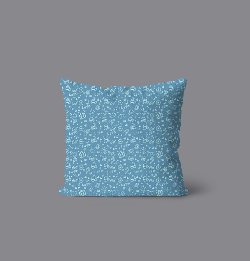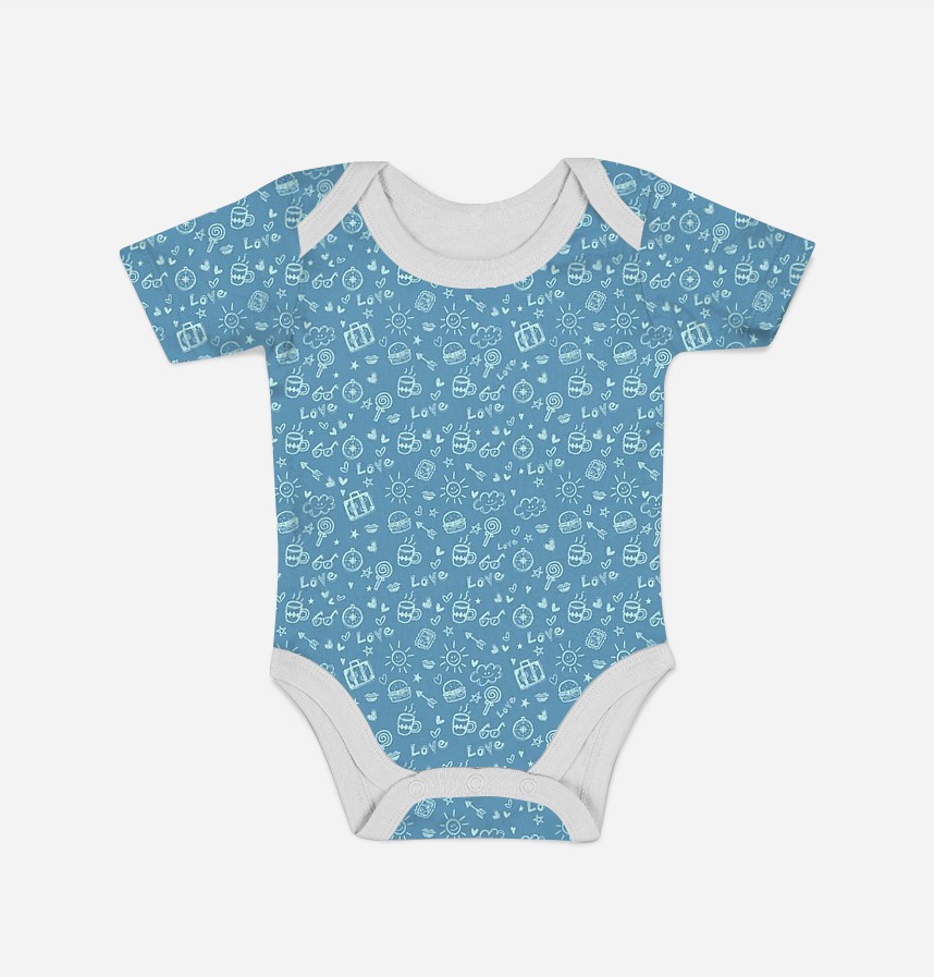 | Design infomation | It is a kitschy mood doodle pattern with various hand-drawing motifs placed repeatedly on a blue background, including hearts, stars, smiling sun, clouds, burgers, mugs, glasses, lollipops, arrows, stamps, lips, and love lettering. Featuring a chalky texture and retro sensibility, it creates a lively and cute atmosphere. |