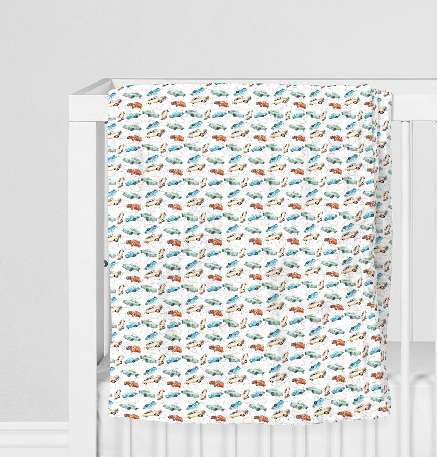 This pattern features a cheerful arrangement of colorful vintage cars, with dotted lines indicating the car's path adding liveliness to the design. The white background makes the colors of the cars stand out even more, giving the overall design a cheerful and fun feel.