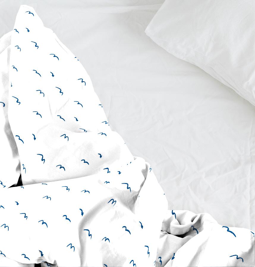 Design infomation This pattern design shows birds repeatedly painted in blue on a white background.
