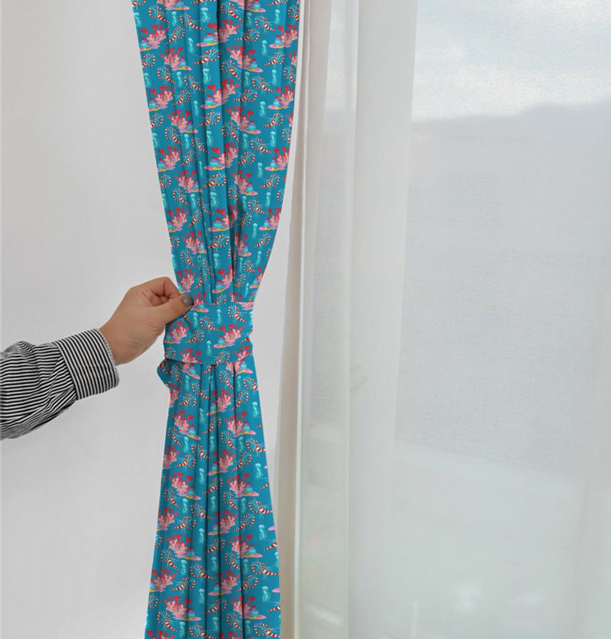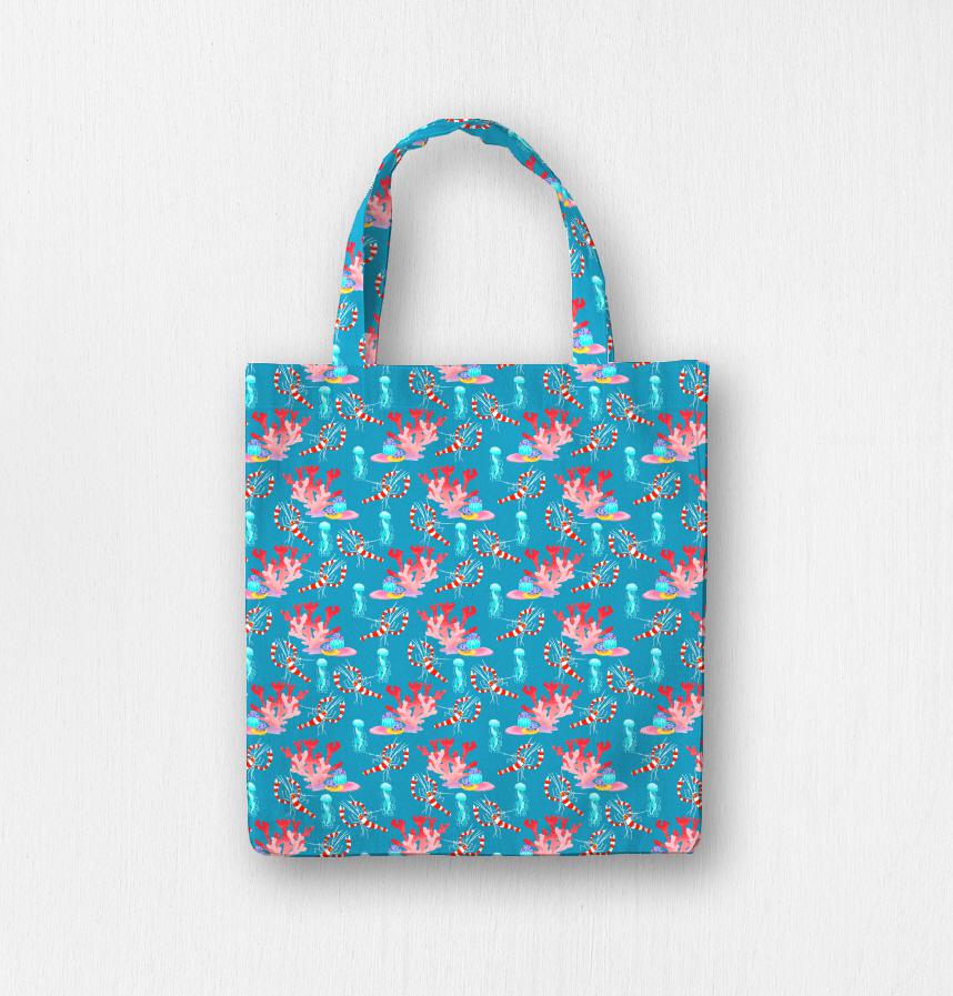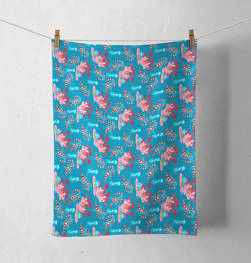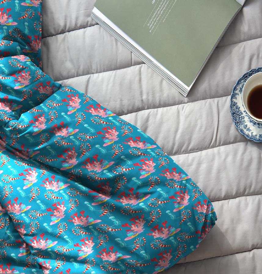 It is a summer design with shrimp, jellyfish, and coral motifs in the image of the southern sea.