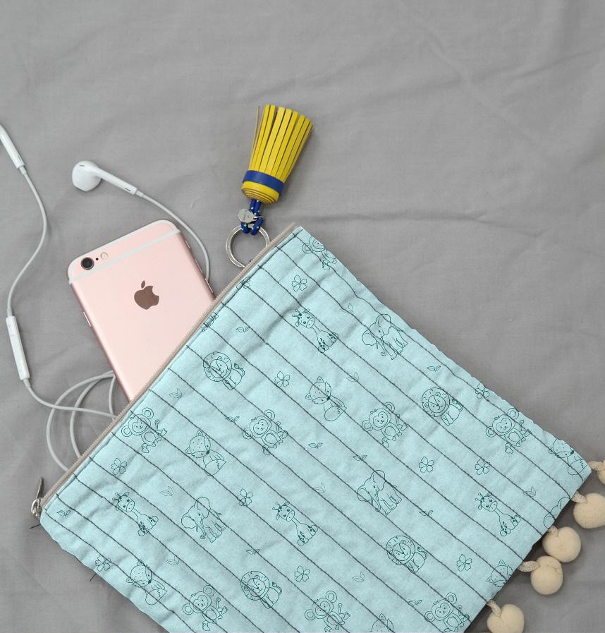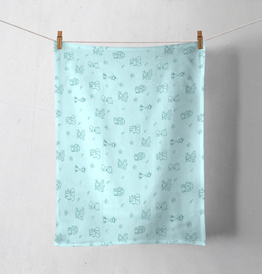 Design infomation | It is a line drawing style design that combines cute safari animal friends. The background is set in a subtle pastel blue tone, with leaves and flowers scattered among the animals for a natural and harmonious feel. |
