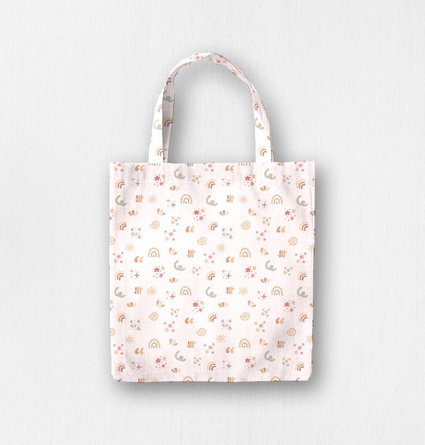 Rainbow, leaves, swirls, sun, stars etc on a warm beige background.