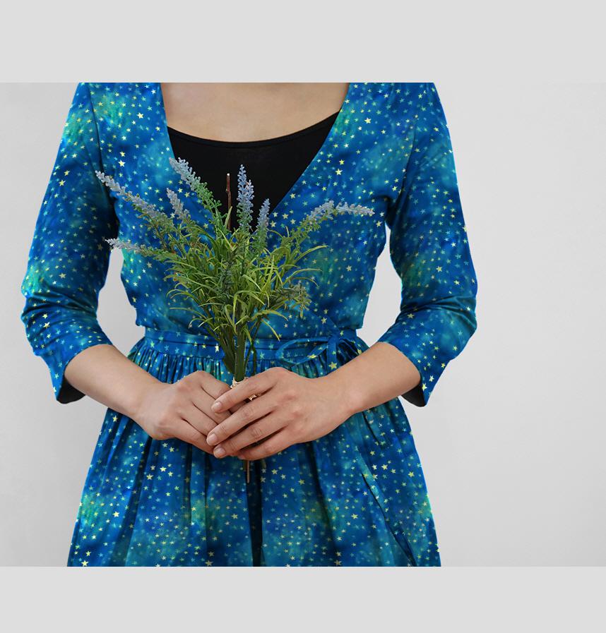 A fantastical night sky pattern with stars falling gently against a background that looks like smudged dark blue ink.