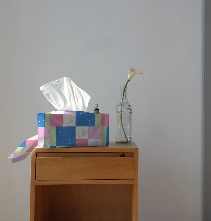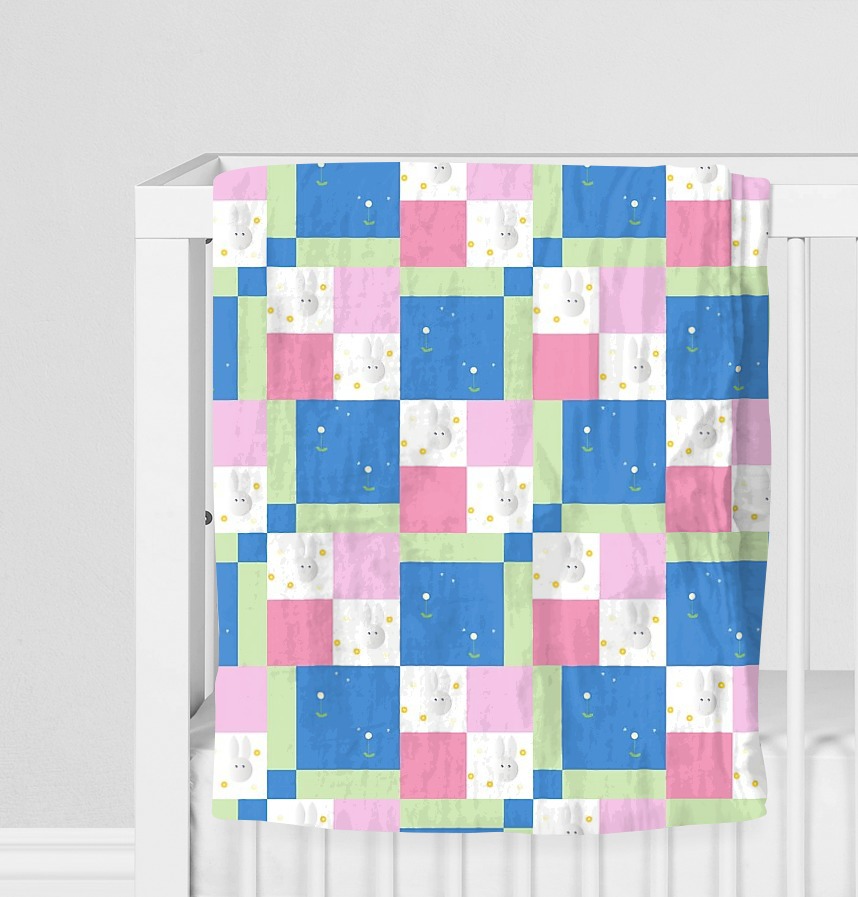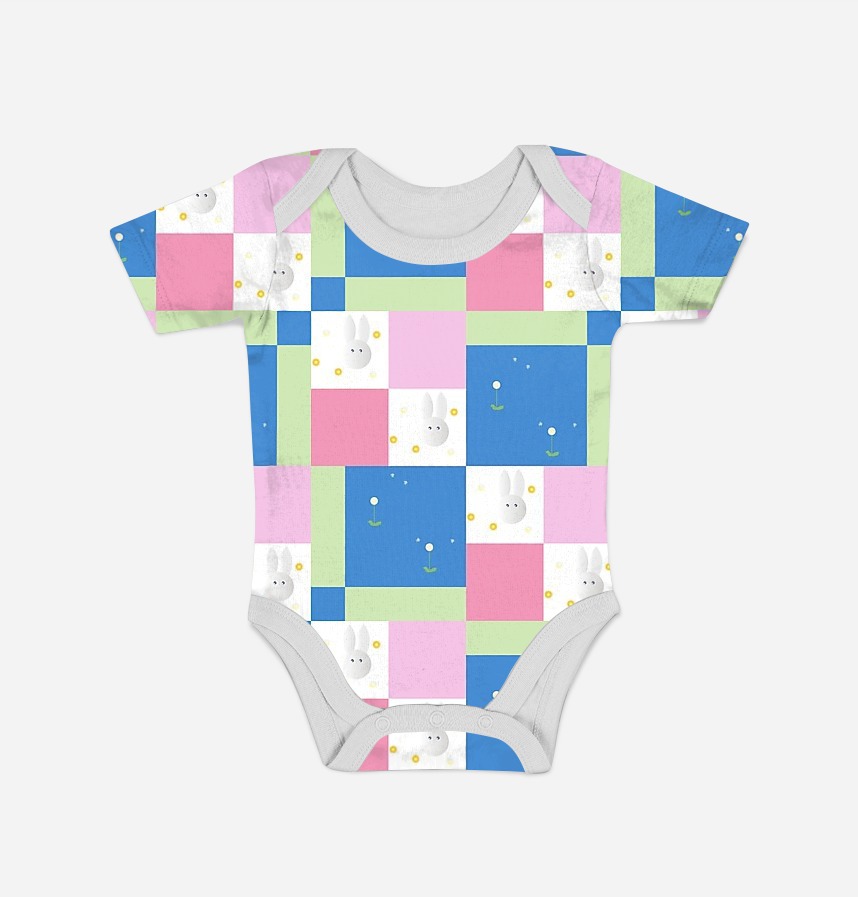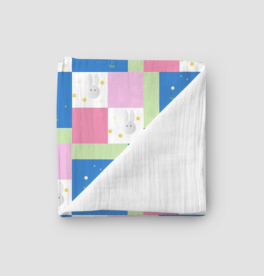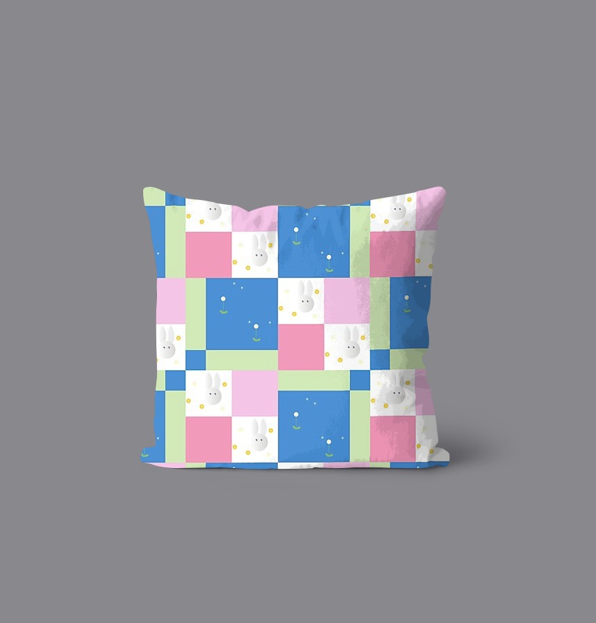 It is a design that repeats rabbits, dandelions, and color patterns.