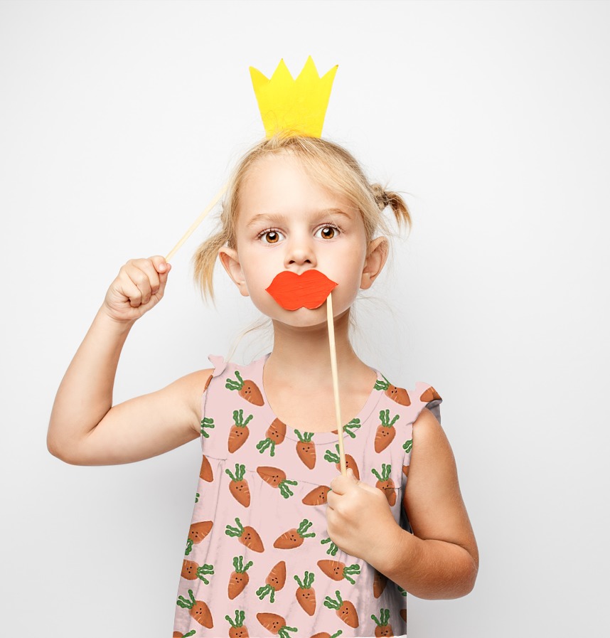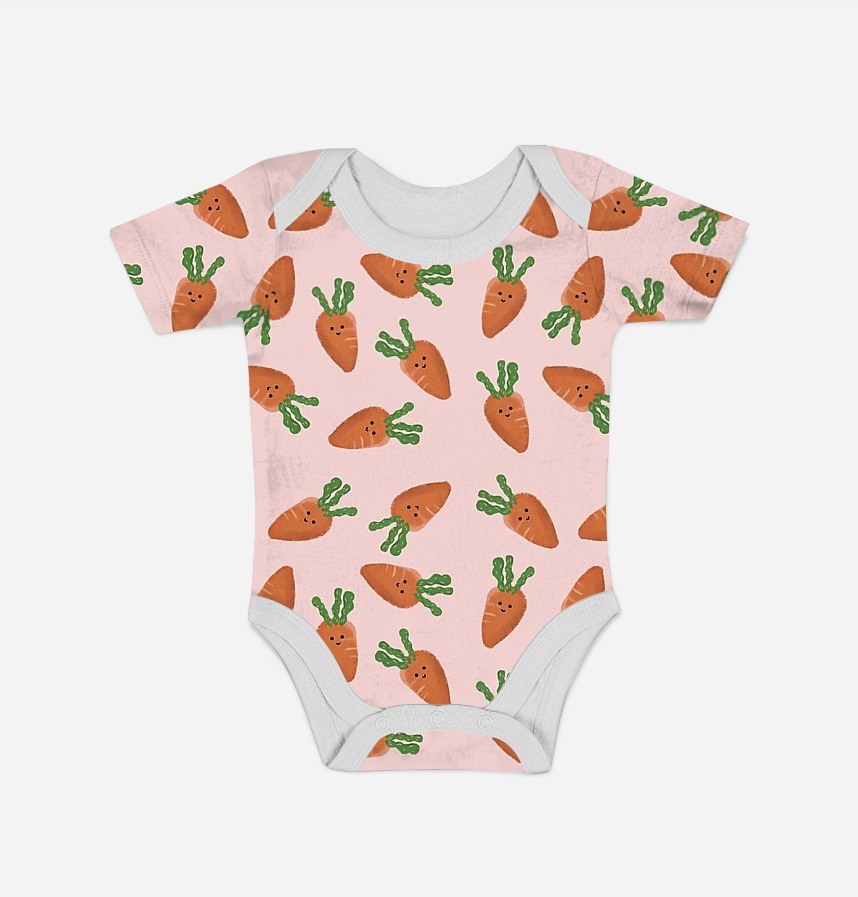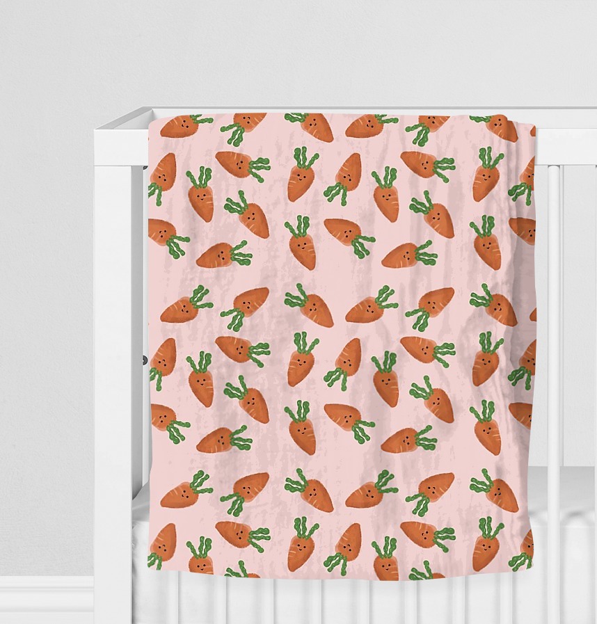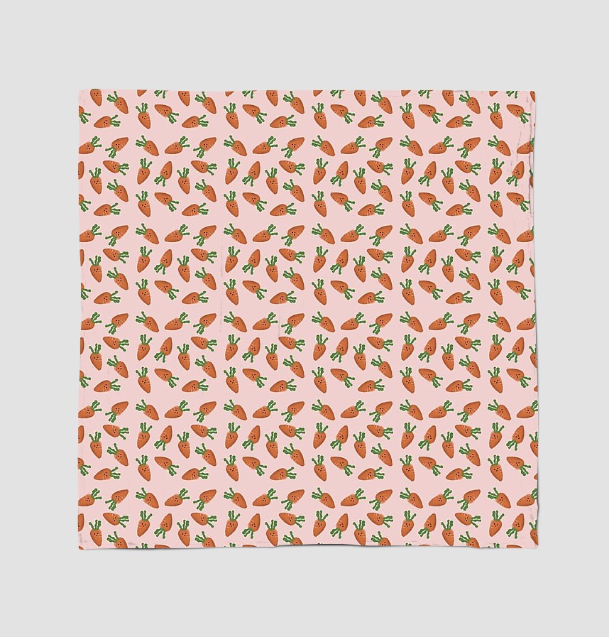 Design infomation It is an all-over pattern with irregular repetitive placement of carrot motifs with facial expressions on a pastel pink background.