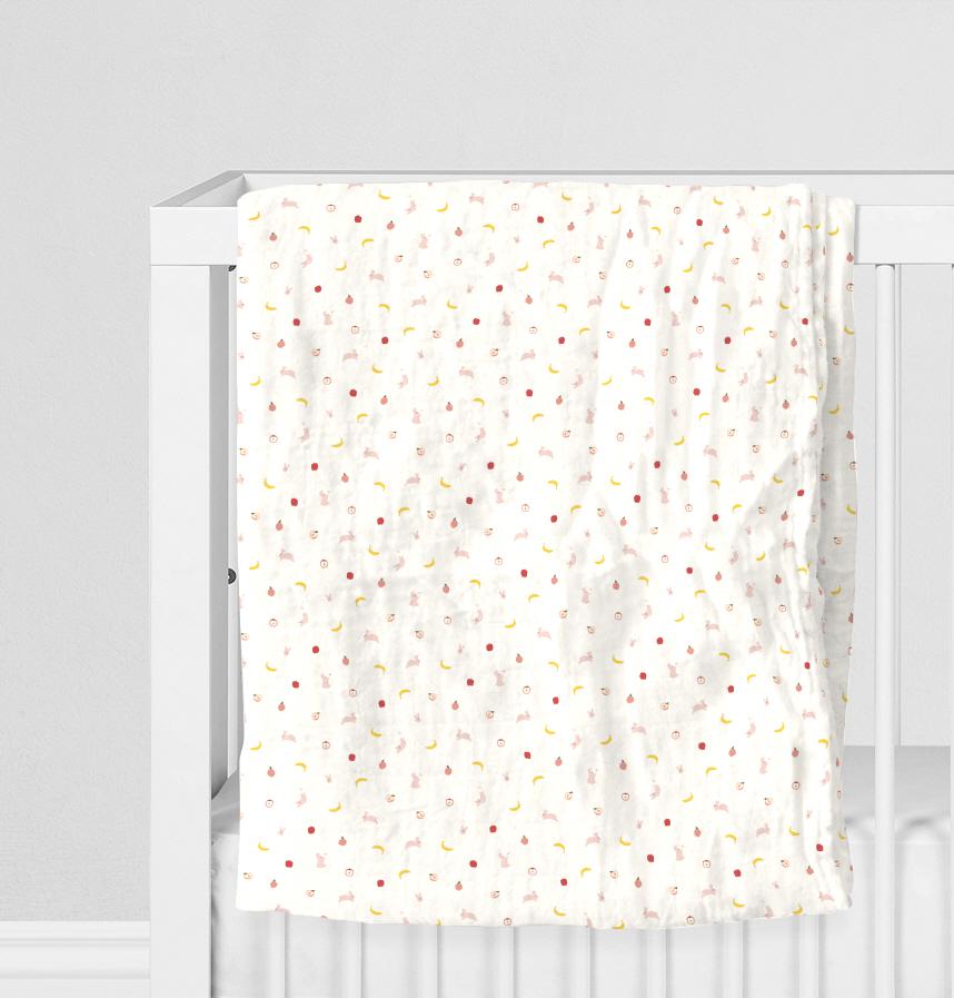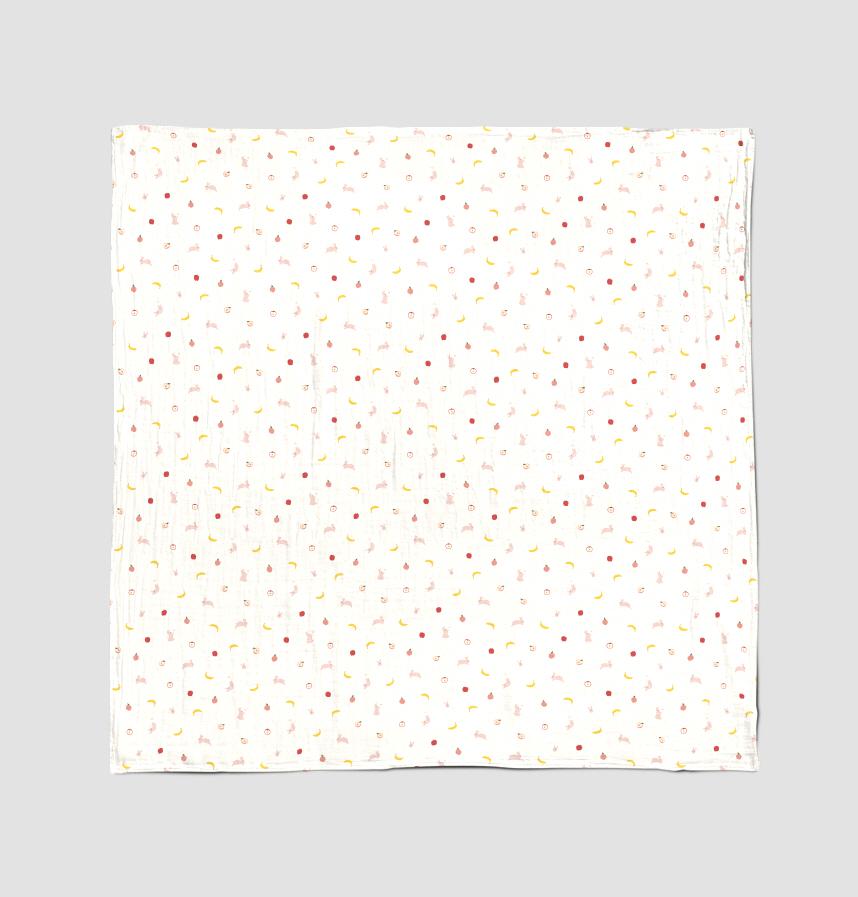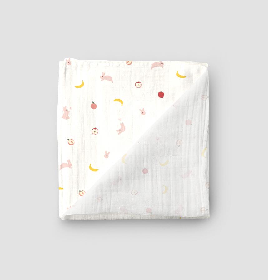 Designed with the motif of pink rabbits and fruits such as apples, peaches, and bananas.