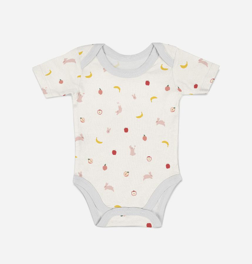 It is designed with pink rabbit, apple, peach, banana, and other fruits in the motif