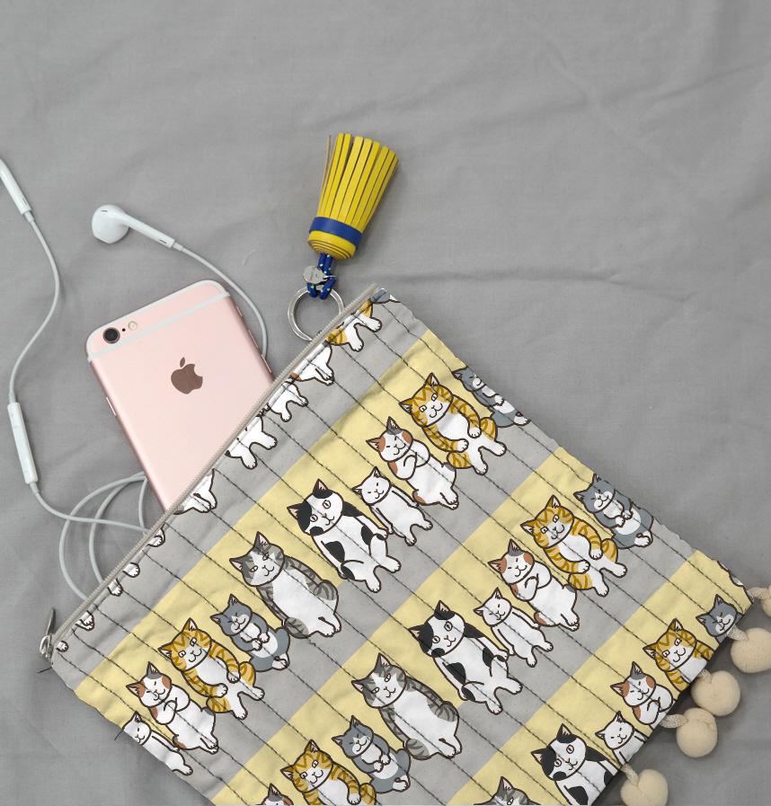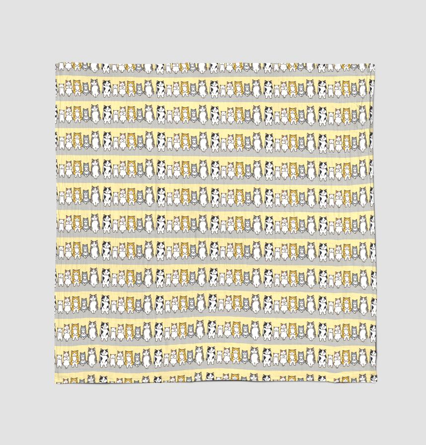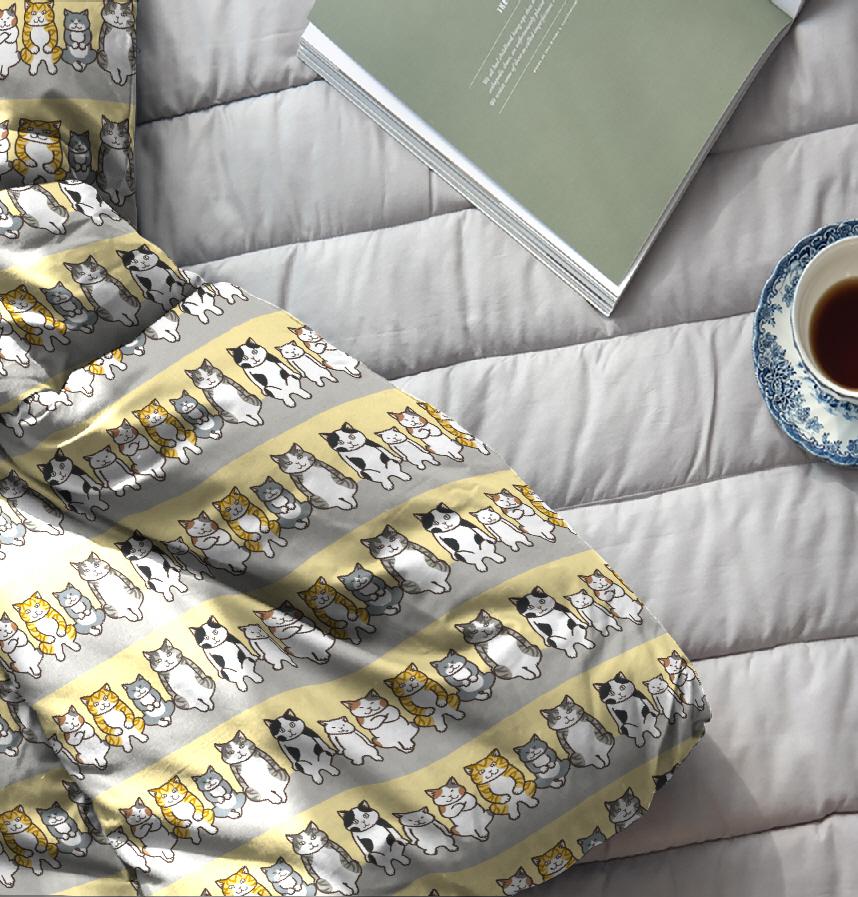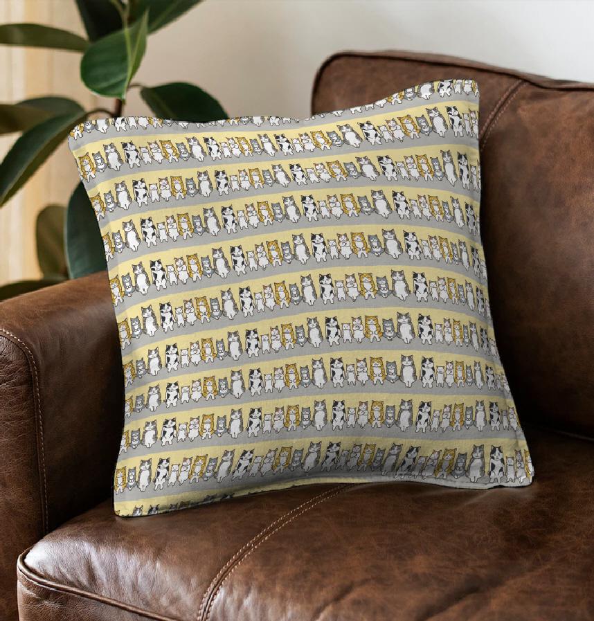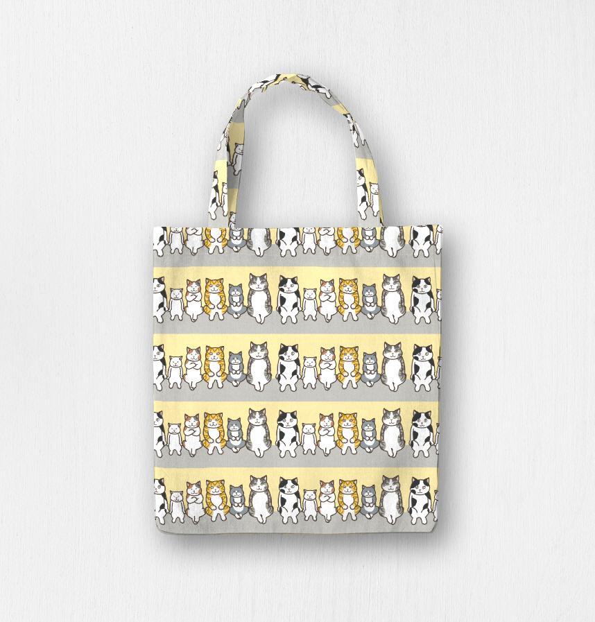 The design features cats sitting side by side on a block. The background colors are white and yellow-green.
