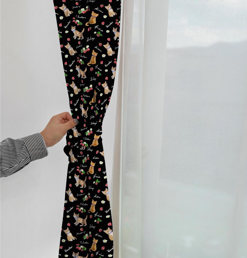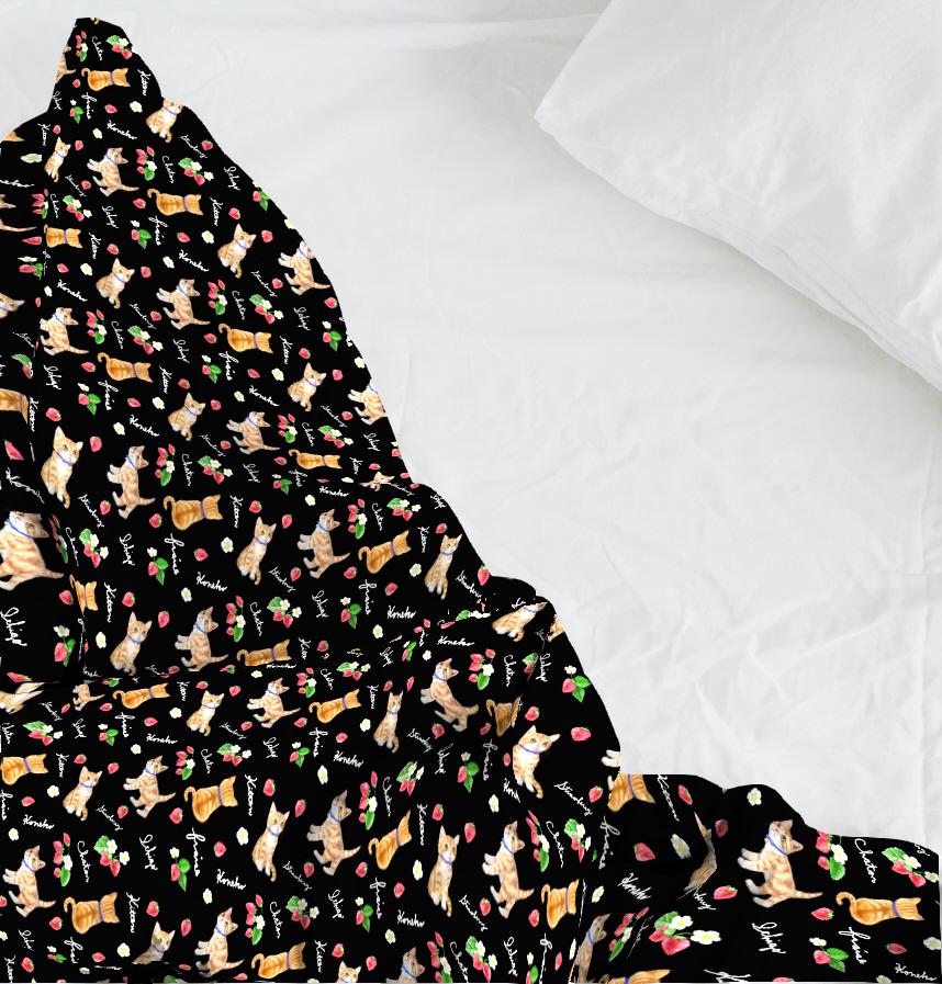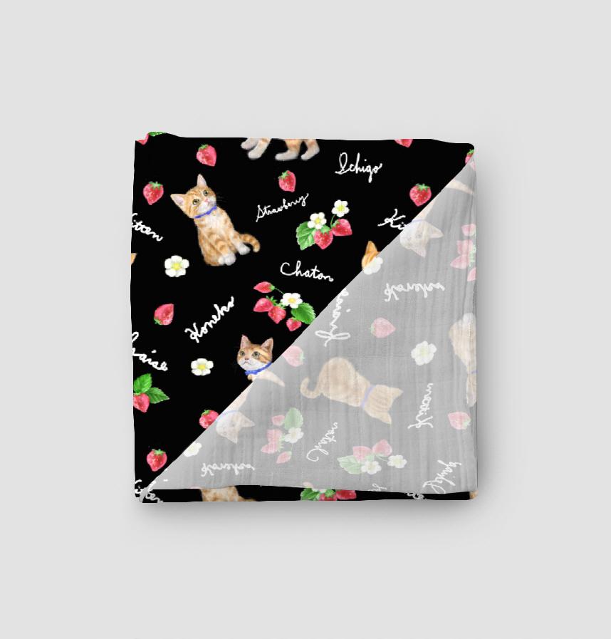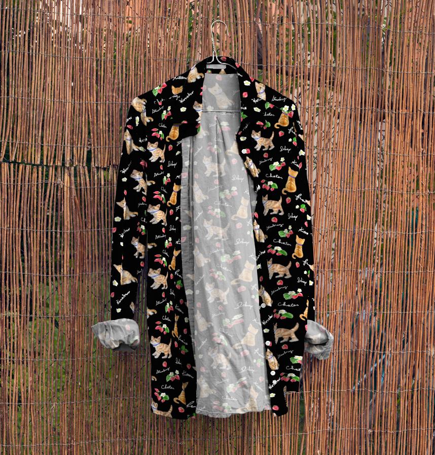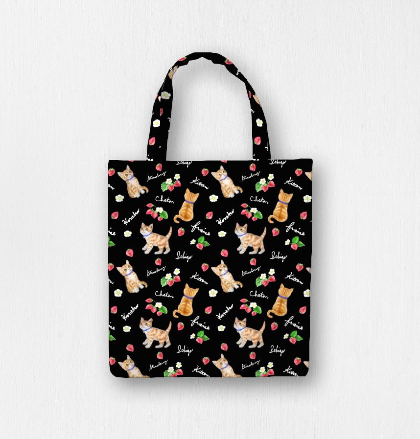 Design infomation Cute strawberries and brown and white kittens in three different poses are scattered on a pink background.