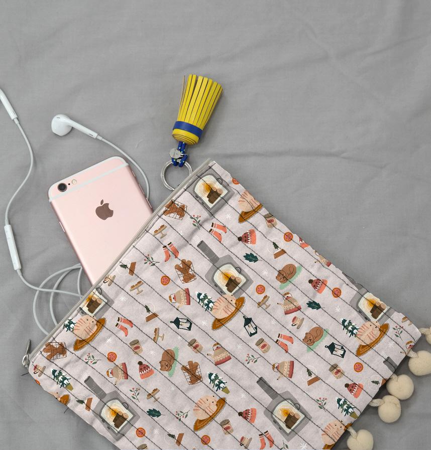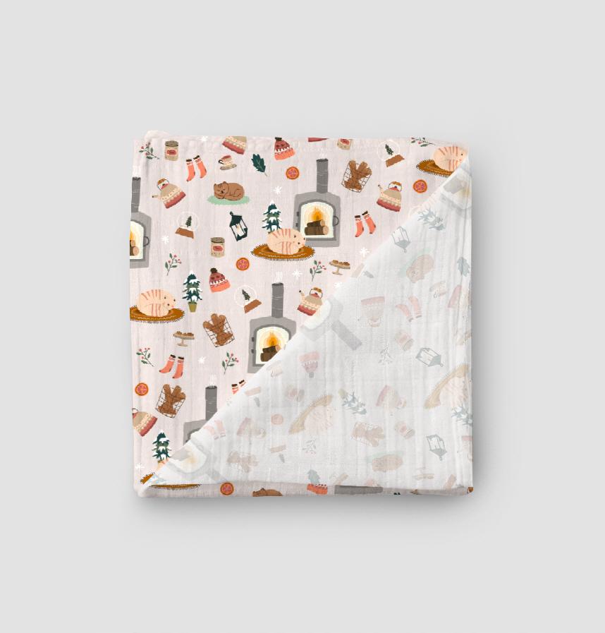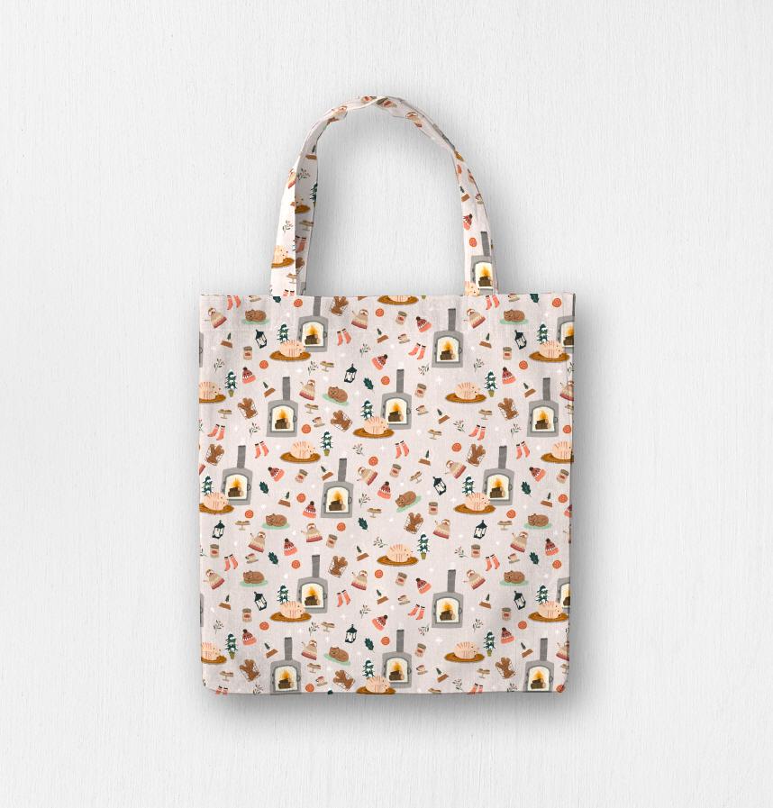 This pattern captures a cozy winter atmosphere with a cat resting comfortably next to a warm fireplace and various winter props. Props such as a teapot, tea, snowball, and socks express a cozy winter routine, and the calm colors create a harmony to provide warmth and comfort to the viewer.