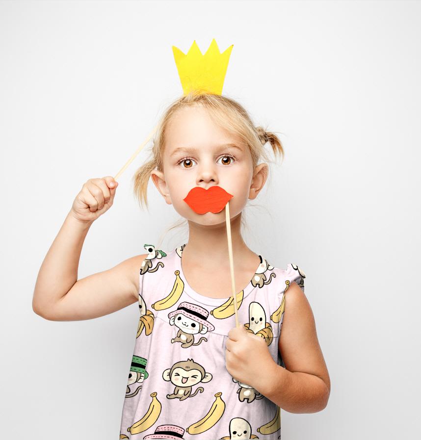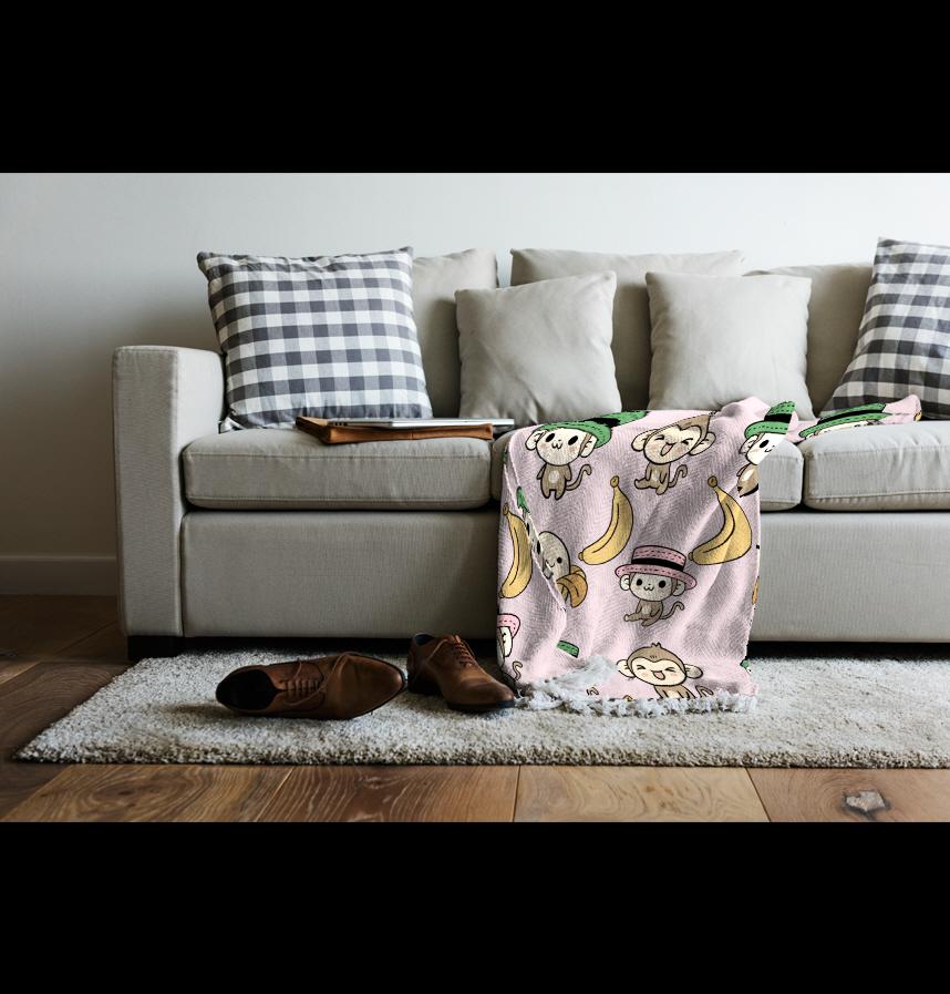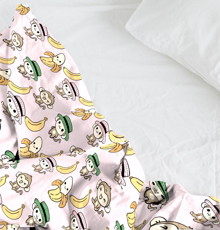 Design infomation This pattern has repeated arrangements of monkeys and bananas on a neat white background. Monkeys have different facial expressions and poses, and some are wearing hats, showing different personalities. Bananas are expressed in various ways, peeled and closed, adding color to the pattern.