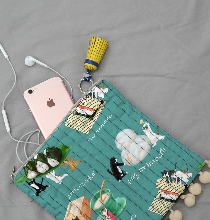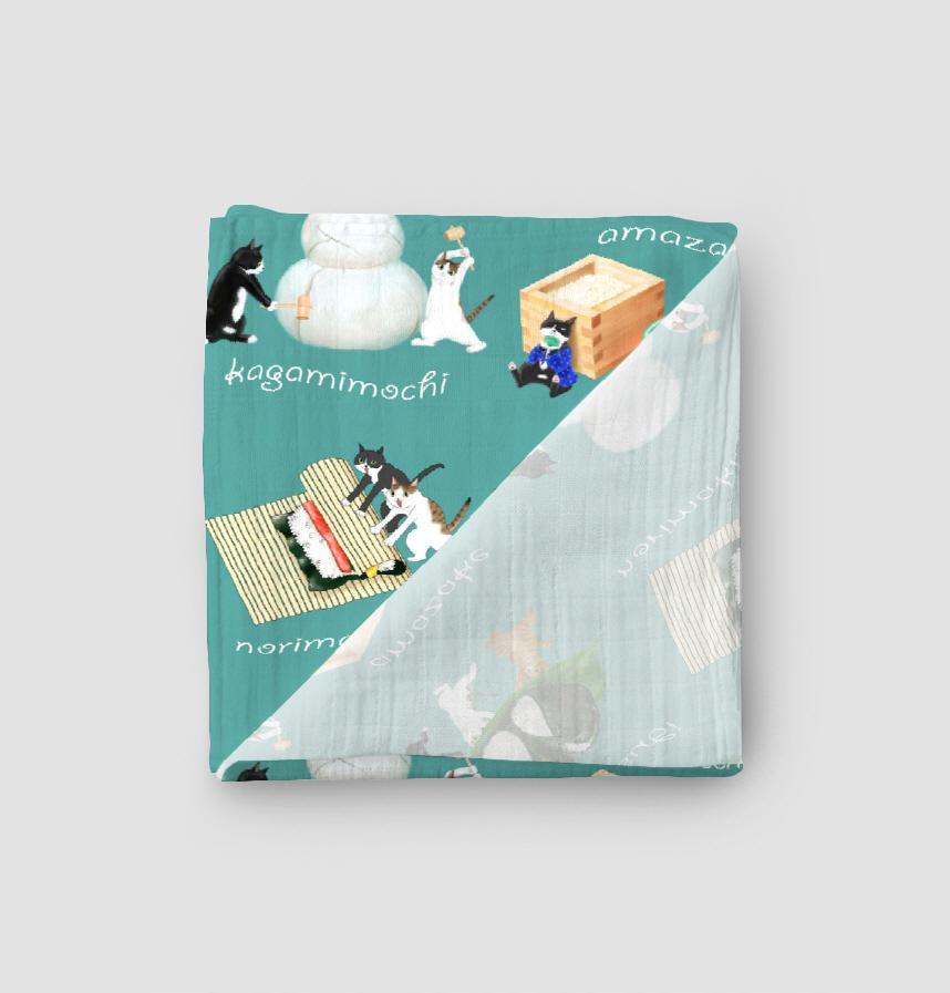 Little kitties bustling around rice foods (Kagami mochi, sweet sake, norimaki, and omusubi)