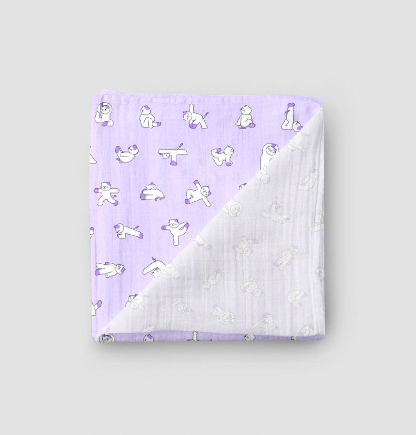 Each cat is enjoying meditation and stretching on a comfortable purple background.