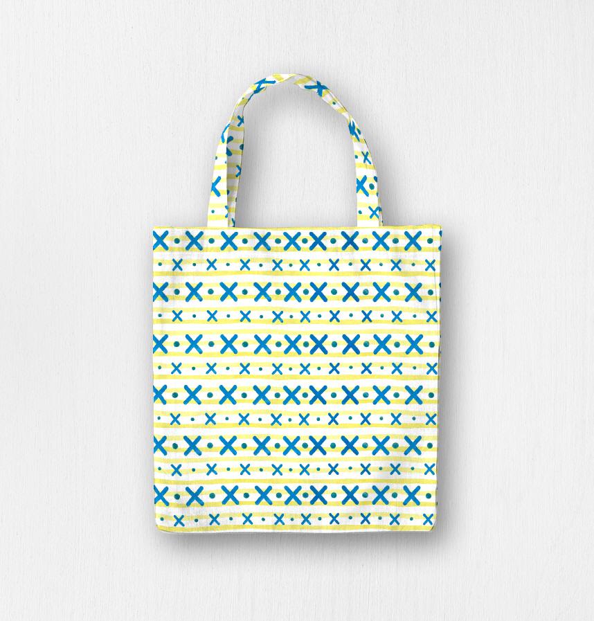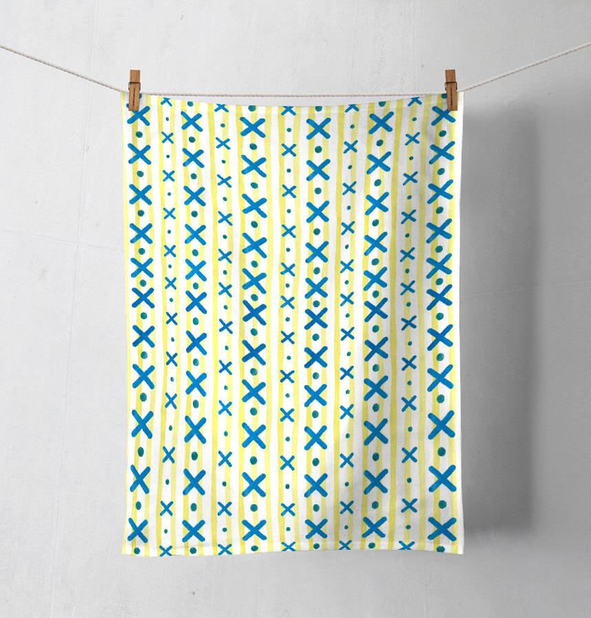 Dot and cross symbol design on striped watercolor background.