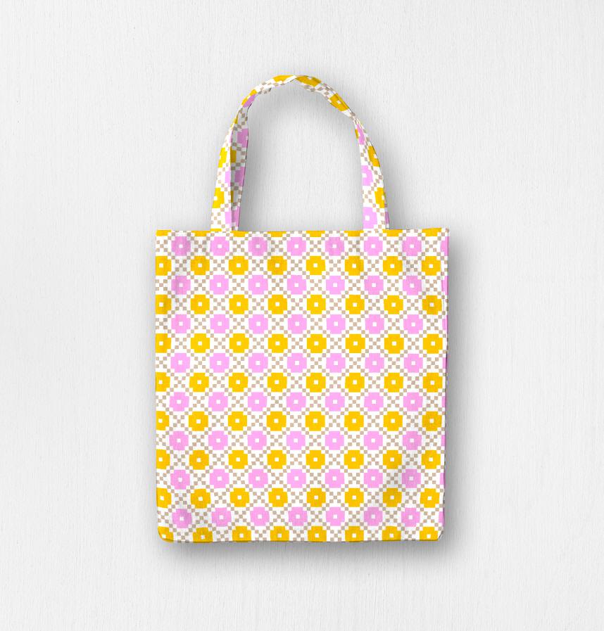 Design infomation | The orange and salmon pink circles were fitted with beige brown plaid. It is a Nordic geometric pattern. |