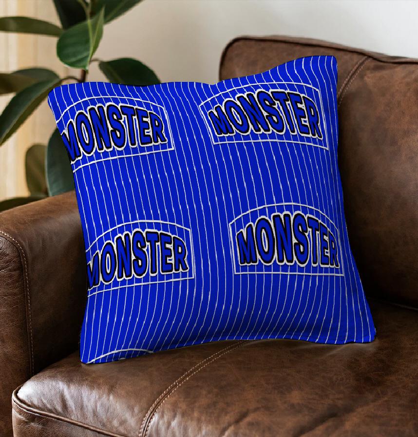 Blue background with white stripes, monster typography