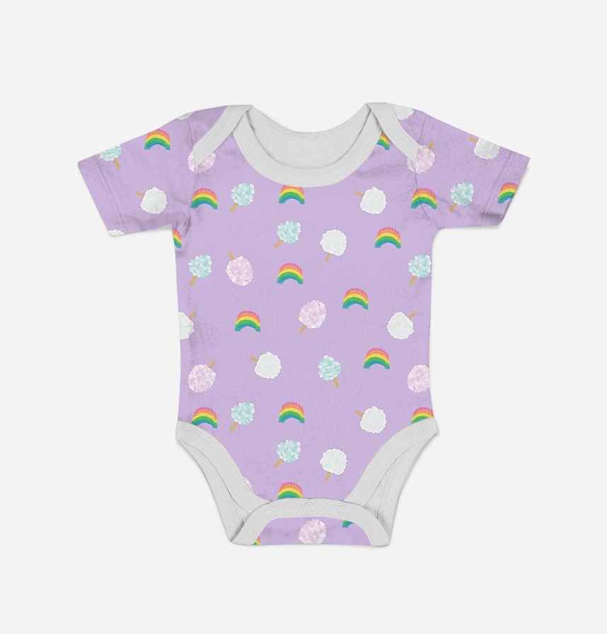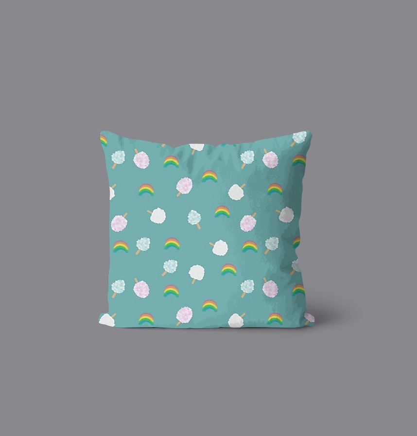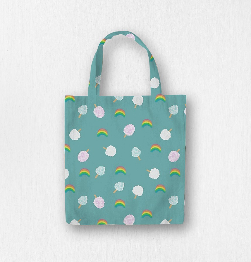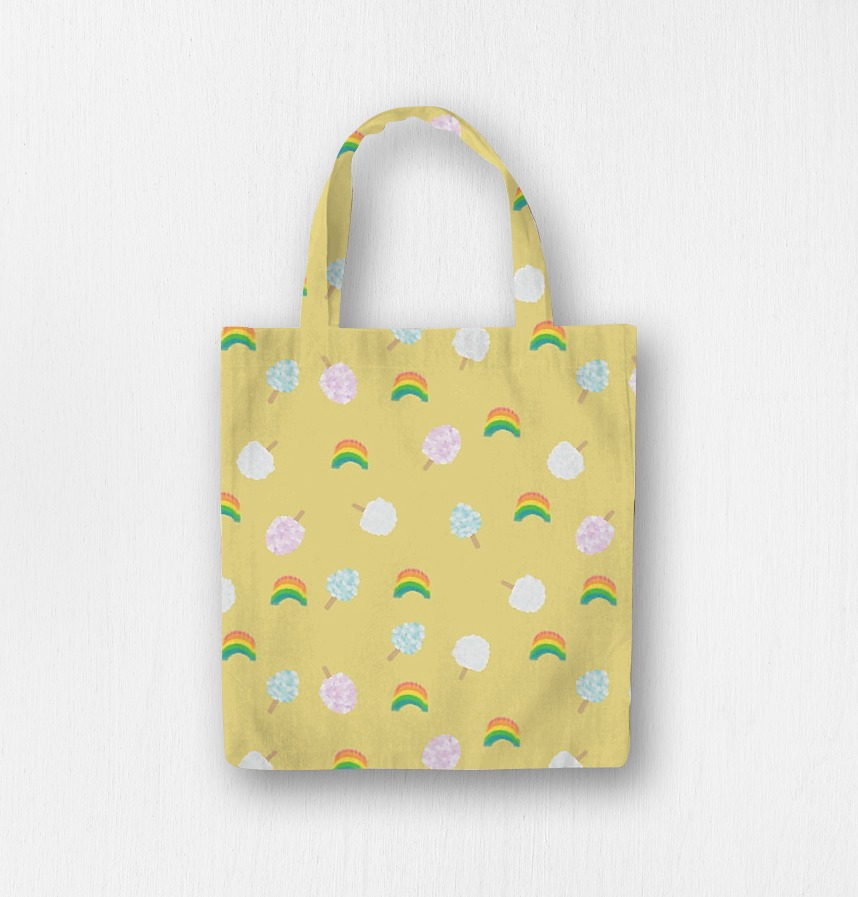 Cotton candy and rainbow in three colors are patterned in pastel tones. The vivid background colors express the lively and innocent atmosphere of the amusement park. |