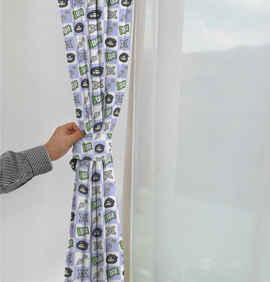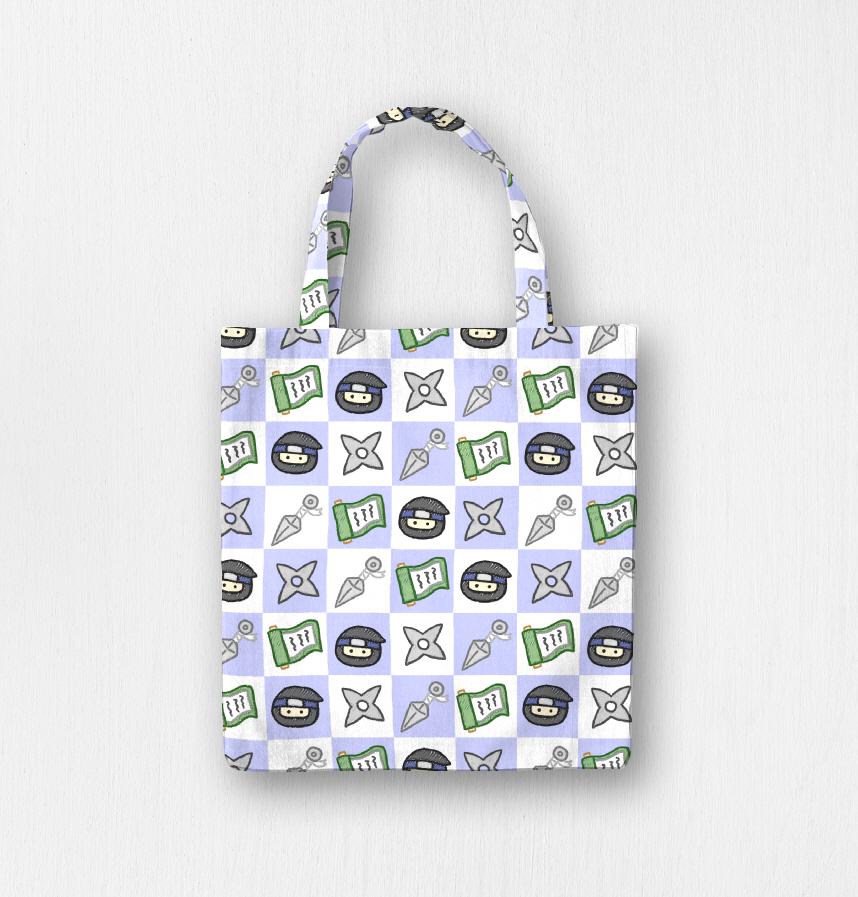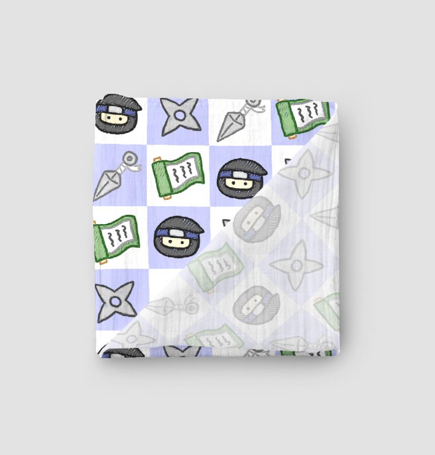 A pattern of a crayon-style ninja and his tools.