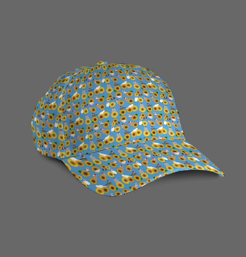 A refreshing design featuring cute Java sparrows and sunflowers.