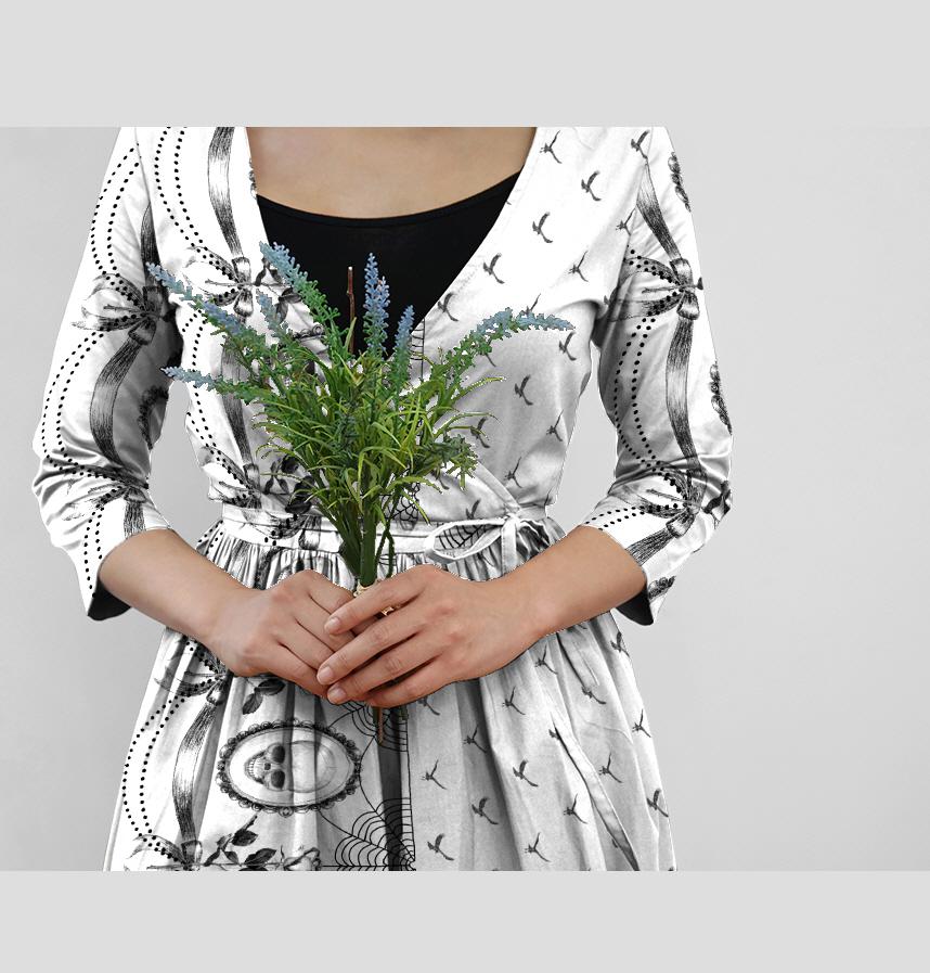 Aside from the pattern at the hem, the silhouette of a flapping crow is arranged in a dot pattern.