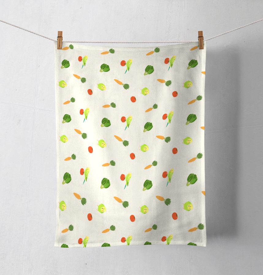 This design combines colorful budgies with vibrant vegetables.