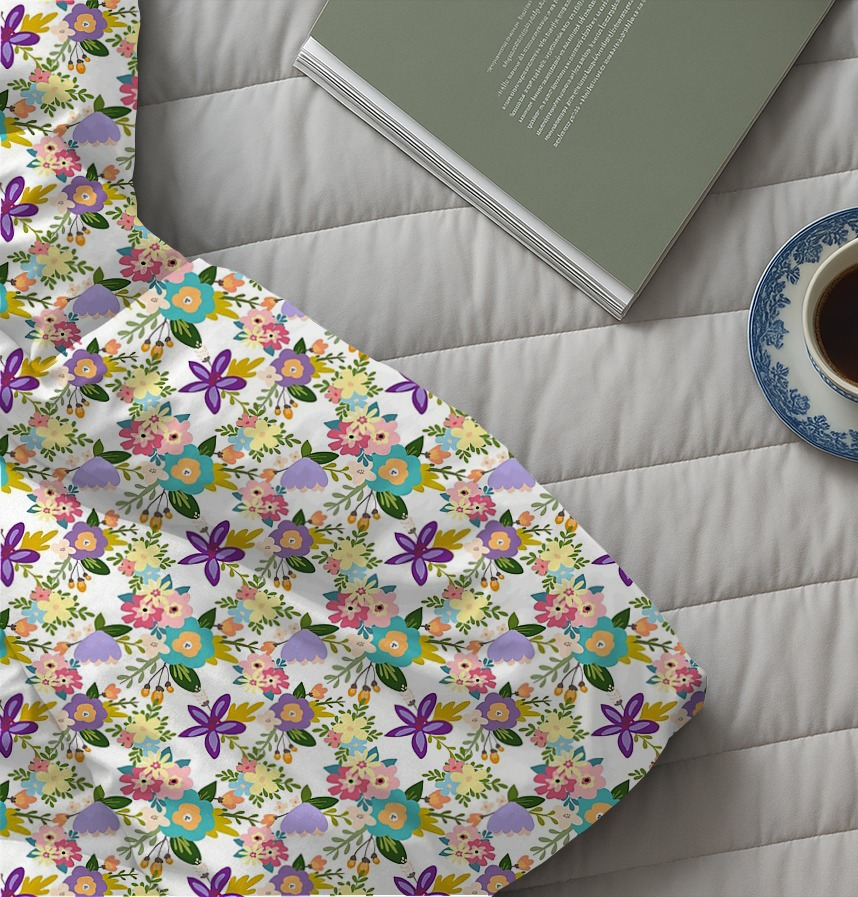 This pattern features a lively repetition of vibrant spring and summer flowers and butterflies. The flowers in a variety of pastel tones—yellow, pink, purple, and sky blue—and green leaves vividly express the vitality and seasonality of nature. The overall design exudes a bright and warm atmosphere, while the soft colors blend harmoniously to create a sense of visual comfort and enjoyment.