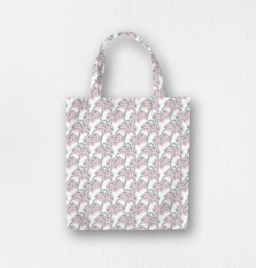 It is a romantic pattern with rich pastel pink and blue-toned flowers connected by frill ribbons on a clean white background. |