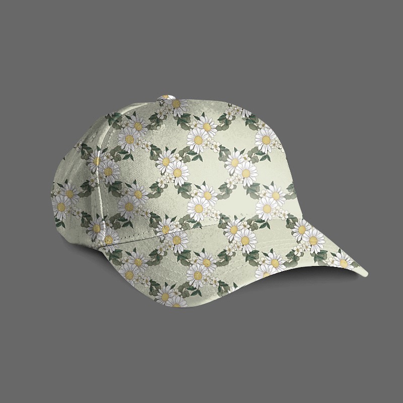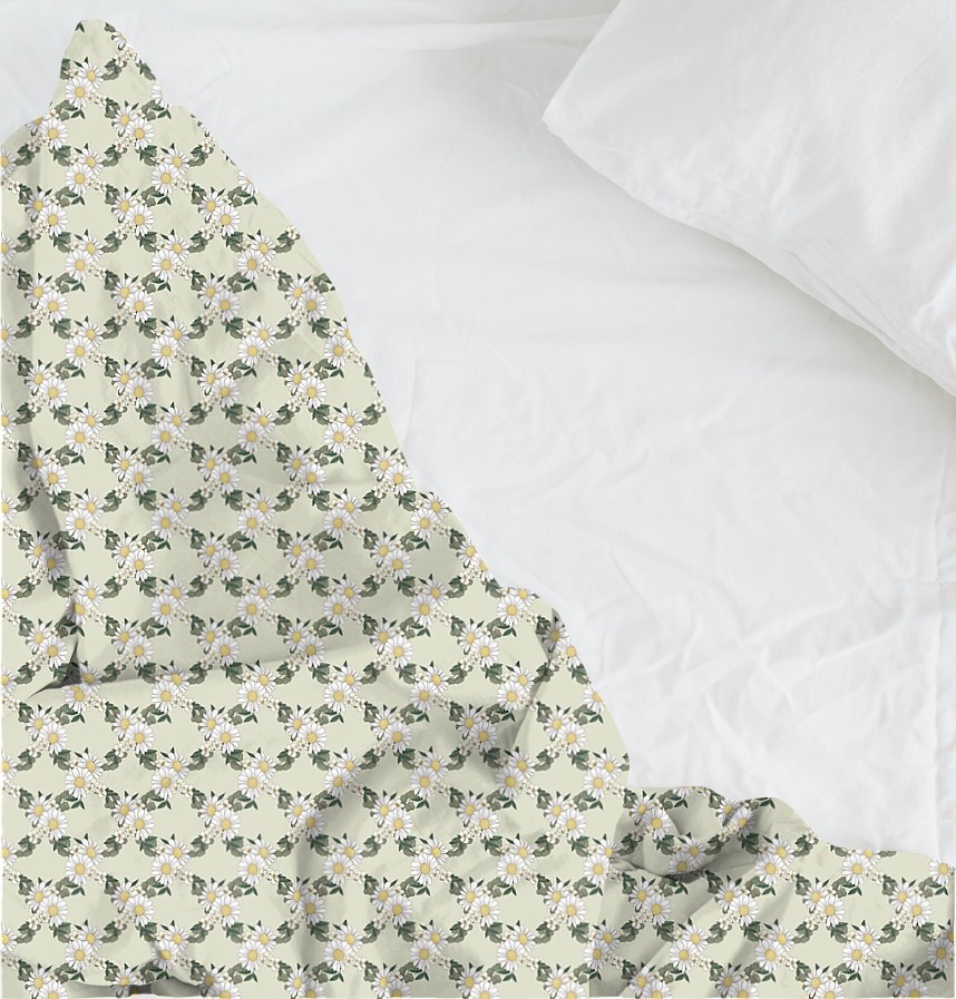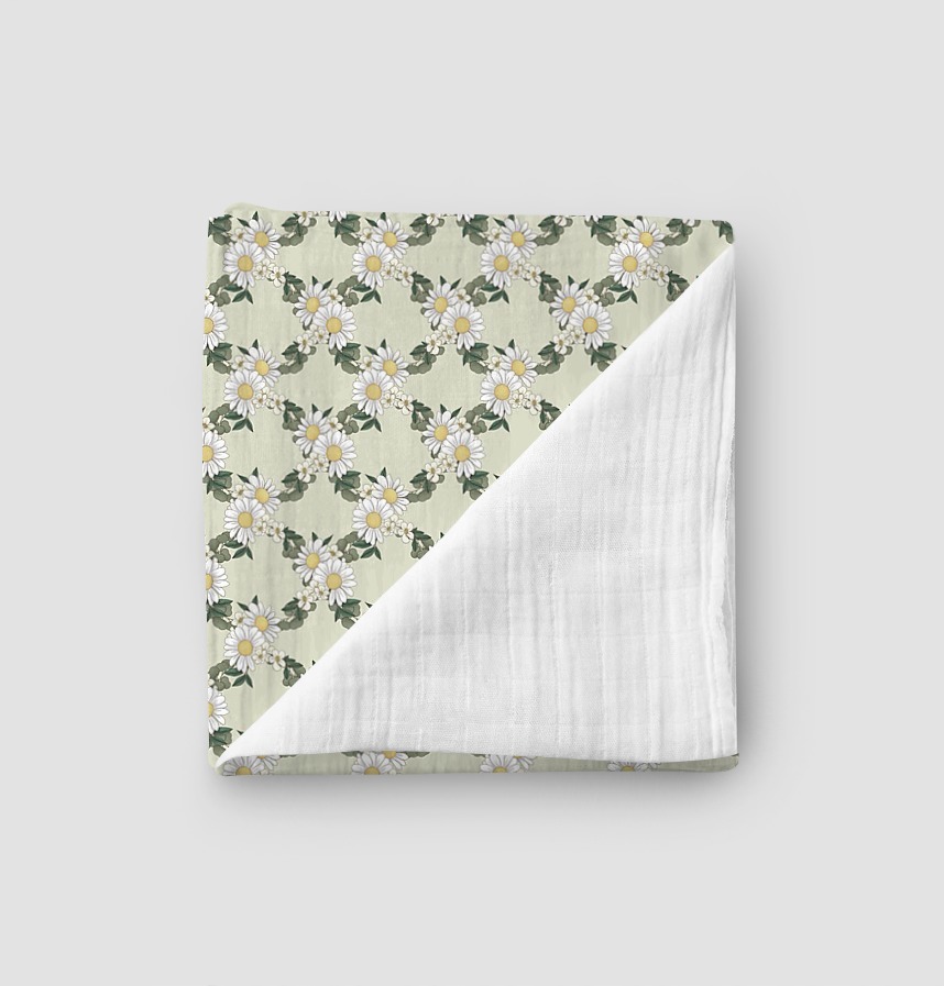 It's an elegant pattern with white daisies and leaves connected in diamond form on a calm sage green background |