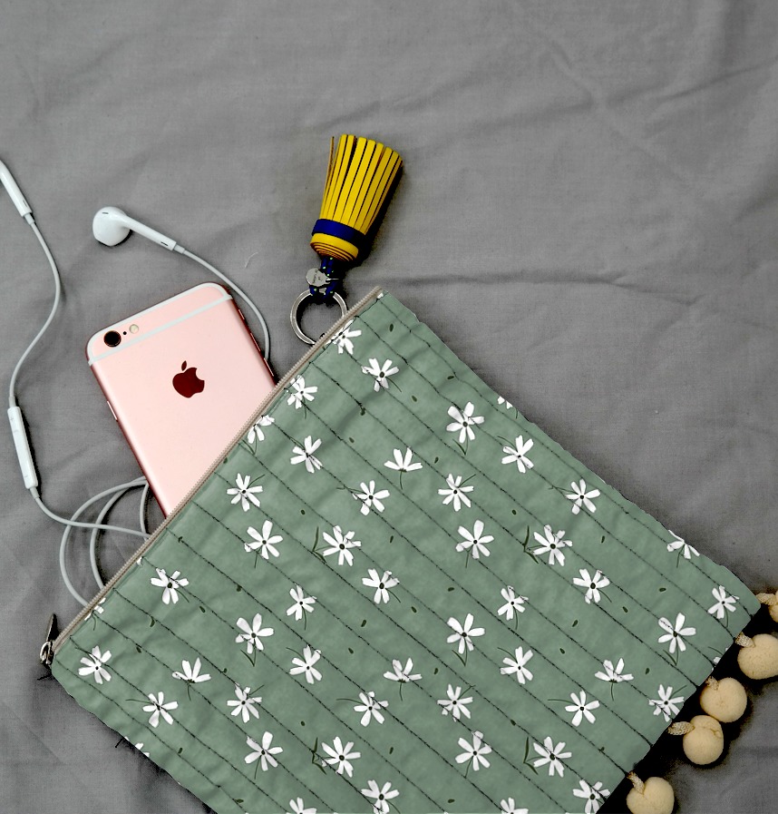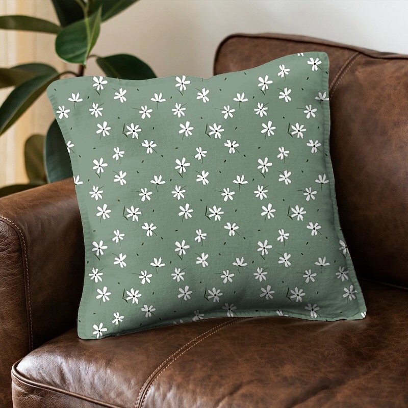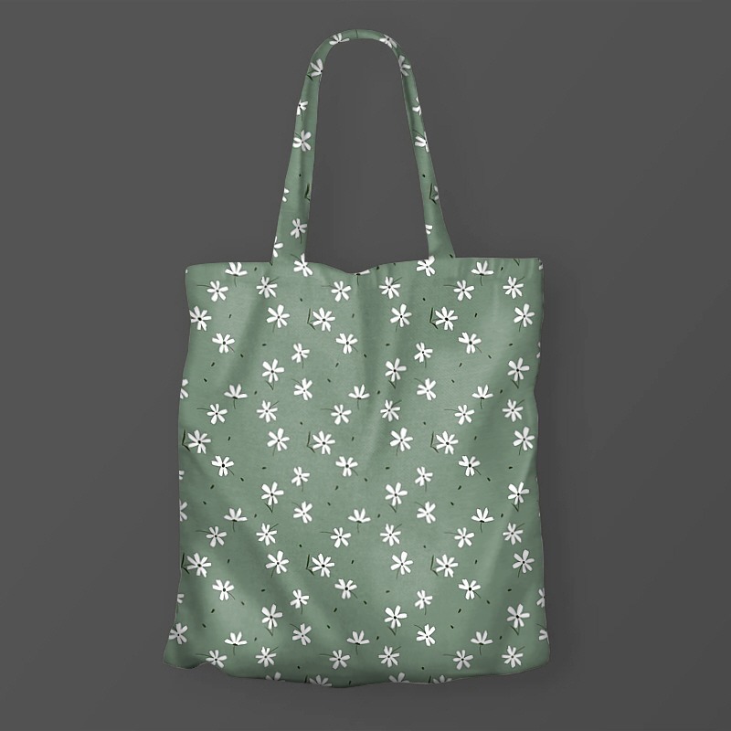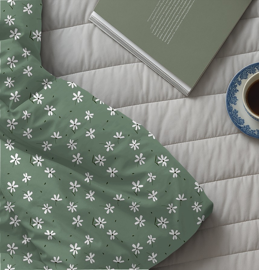 The design is neatly arranged on a toned-down green background with white flowers and leaf fragments that feel like a minimal hand painting. |