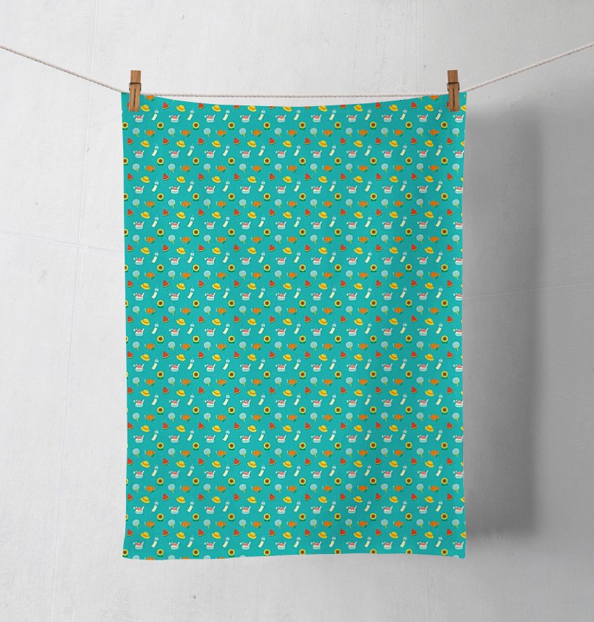 A cute seamless pattern featuring motifs that evoke the feeling of Japanese summer, such as goldfish, fans, wind chimes, sunflowers, watermelons, and shaved ice.