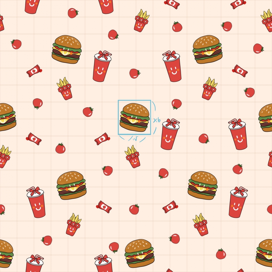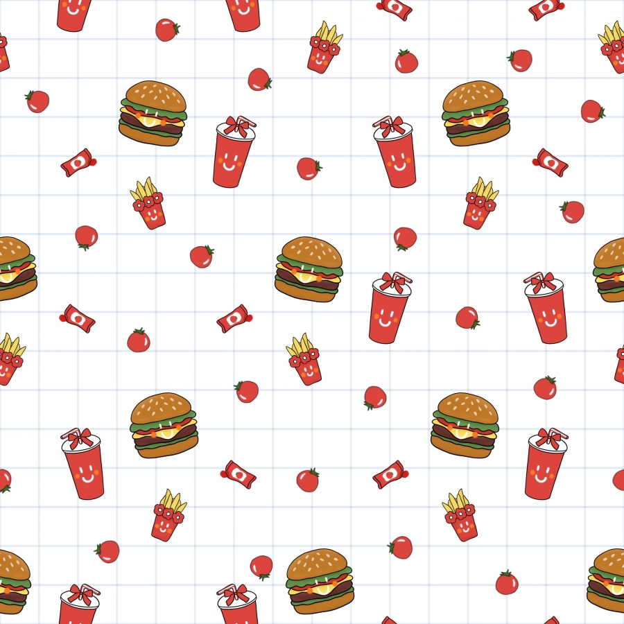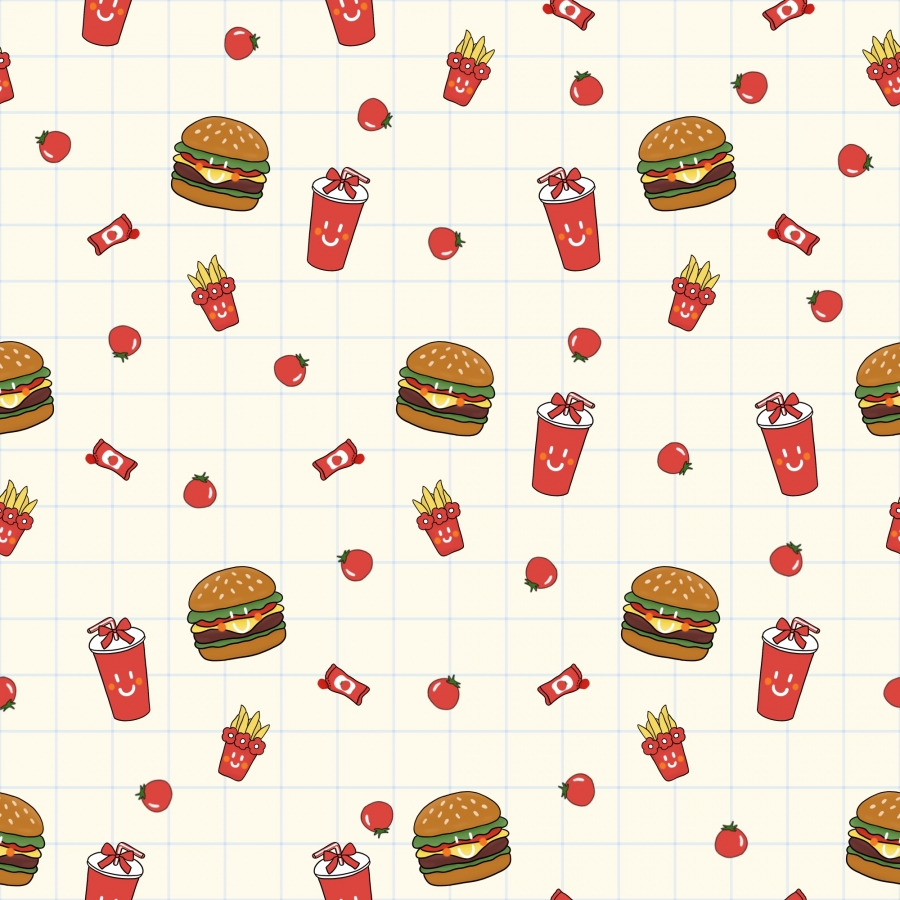 Cute food character patterns of hamburgers, fries, cola, etc., scattered over soft checkered