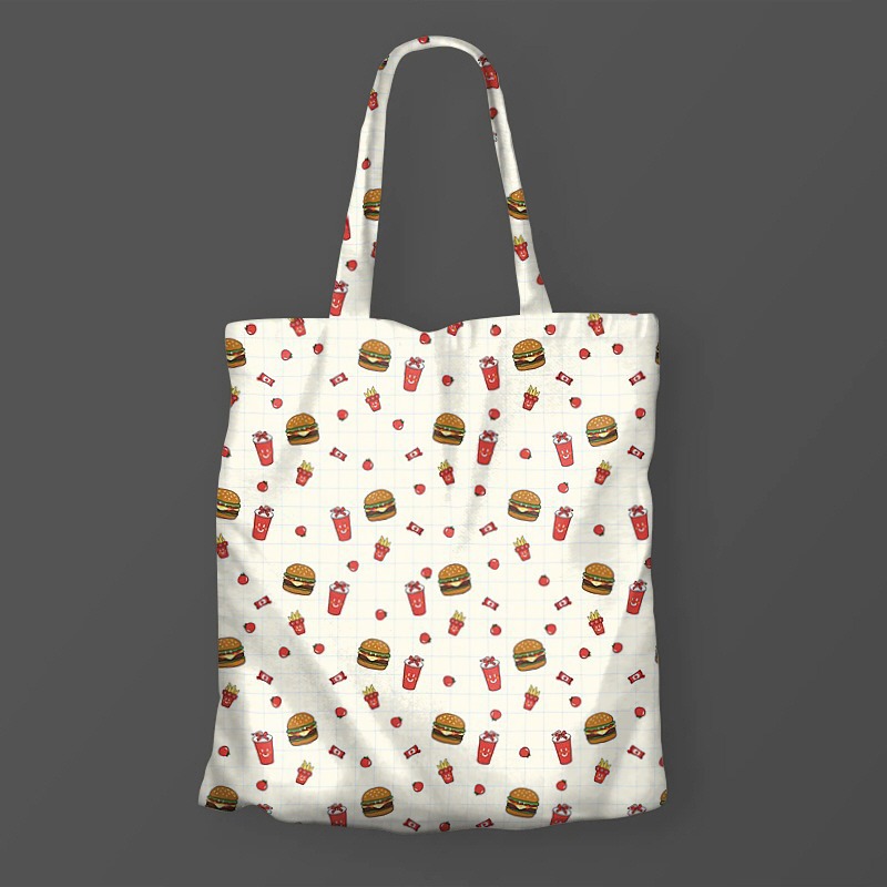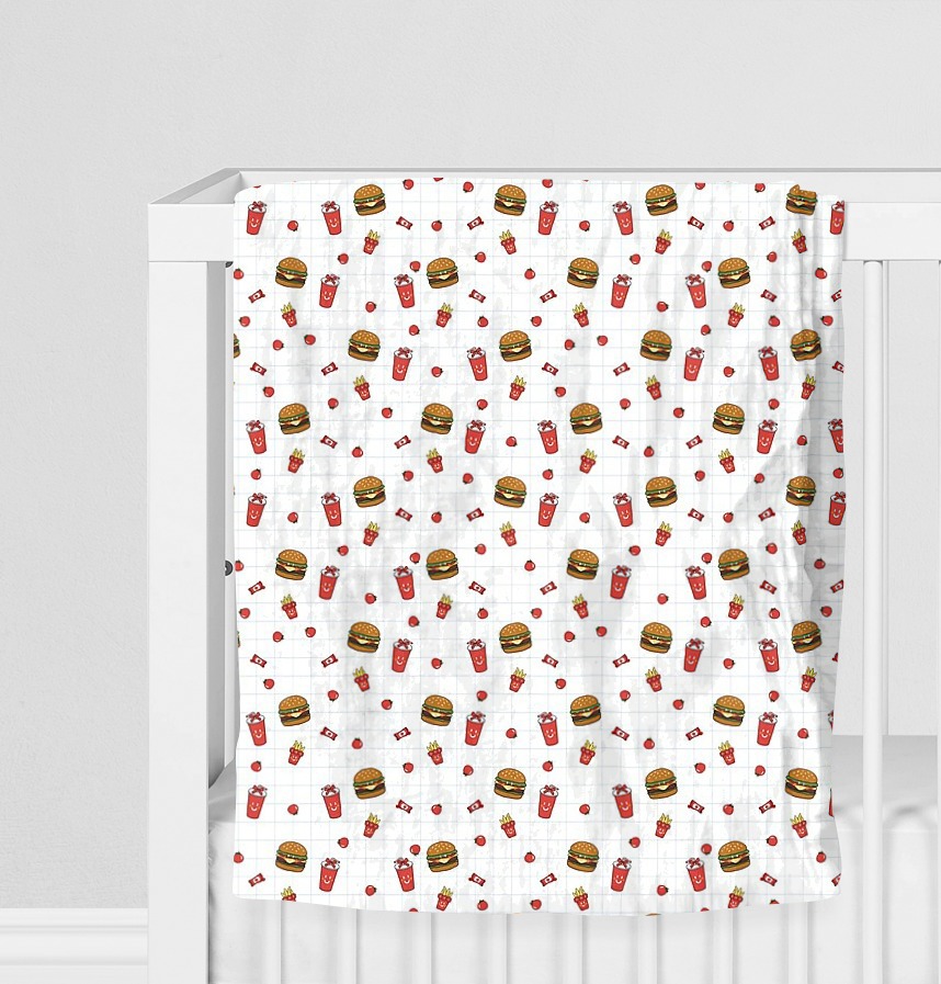 Cute food character patterns such as hamburgers, french fries, and cola scattered on soft checks