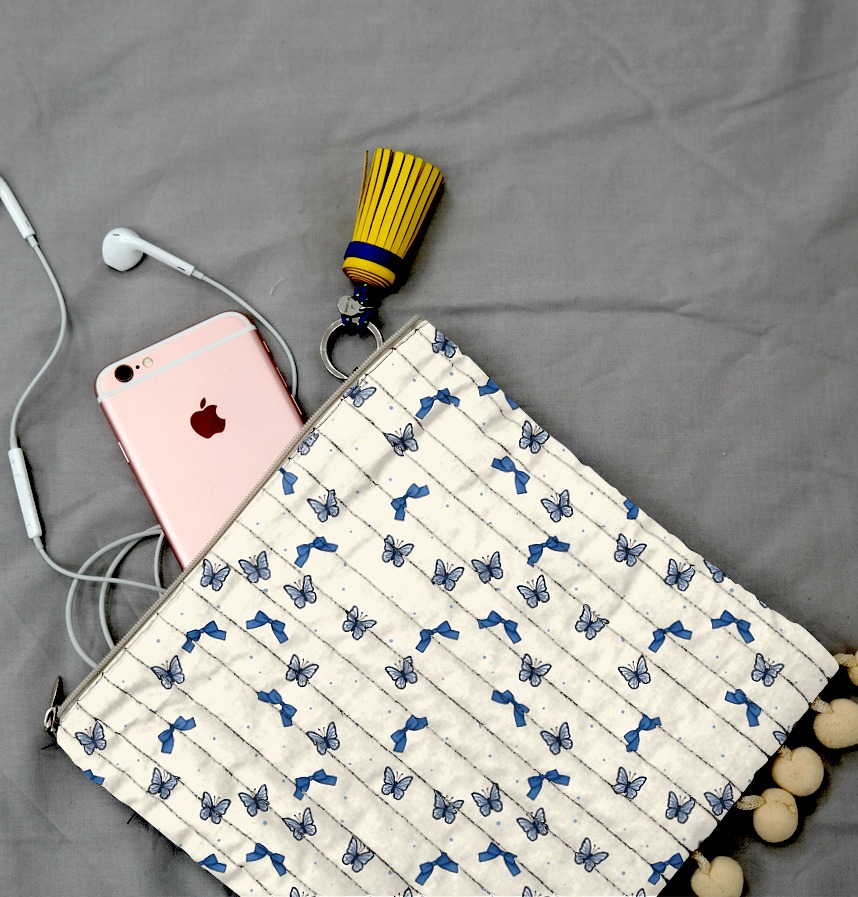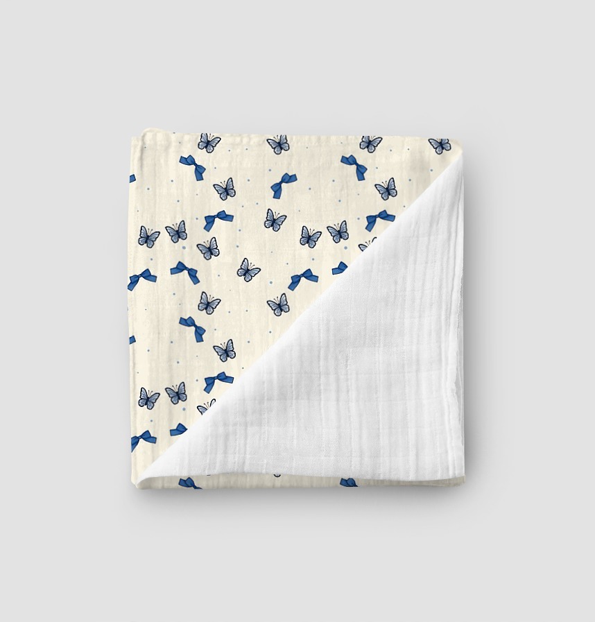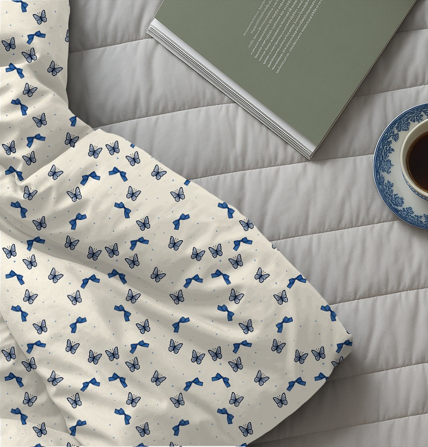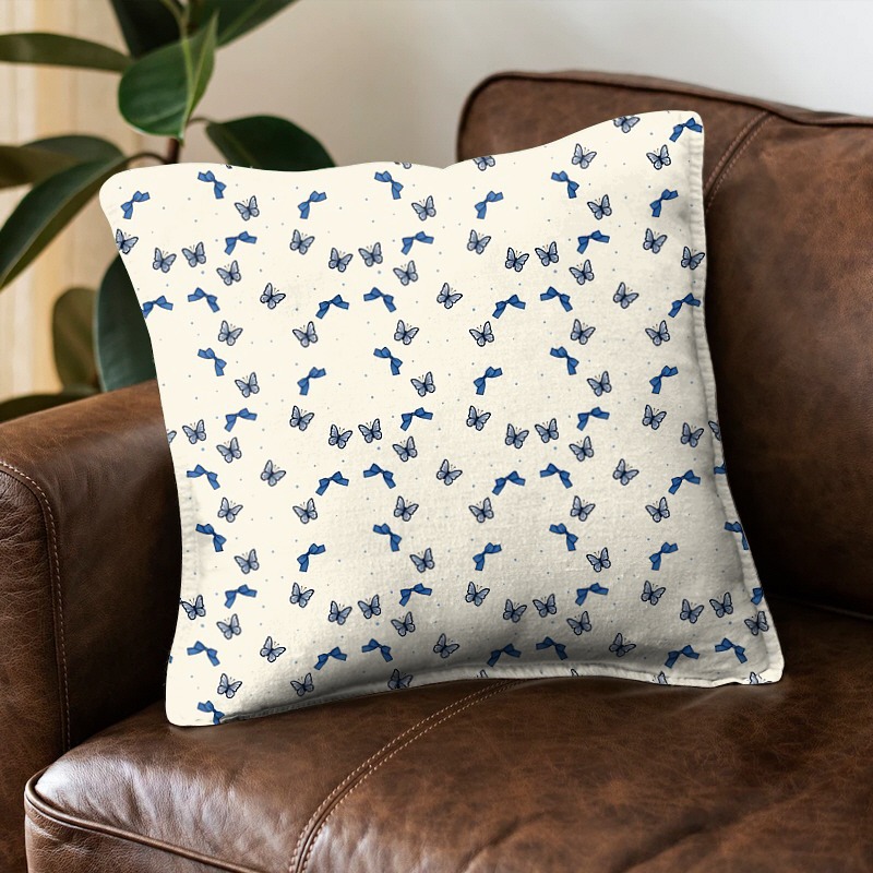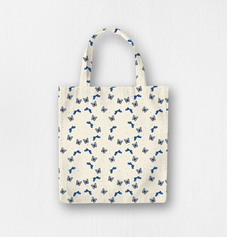 It is a pattern in which vintage blue butterflies, ribbons, and small dots are cutely scattered on a warm cream-colored background. |