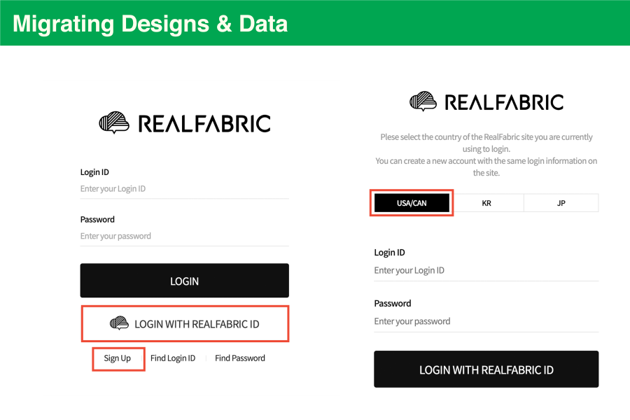 Select the country you used on the existing RealFabric site, enter your ID,