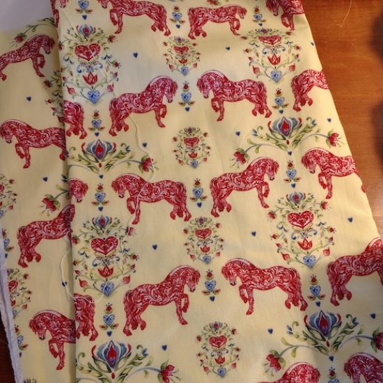 I have ordered this design on the linen fabric several times because I like how it mimics Swedish woven textiles with the natural off-white color of the fabric. Always love the softness and absorbent feel of this linen. It is also easy to press and doesn't need a really hot iron to get out creases.