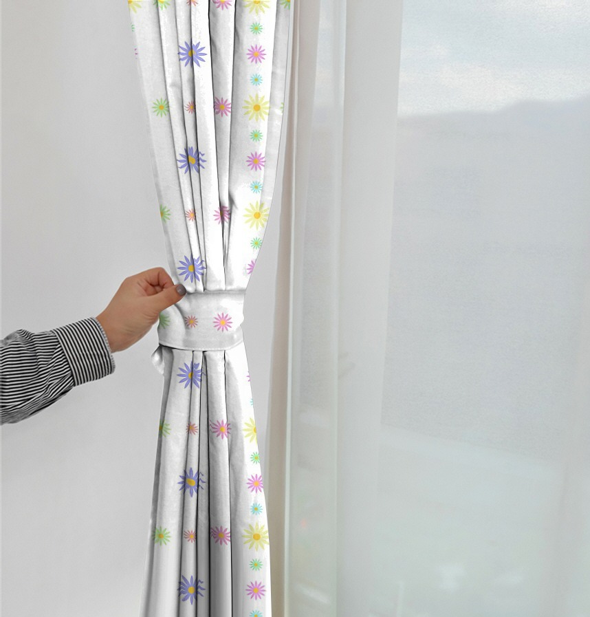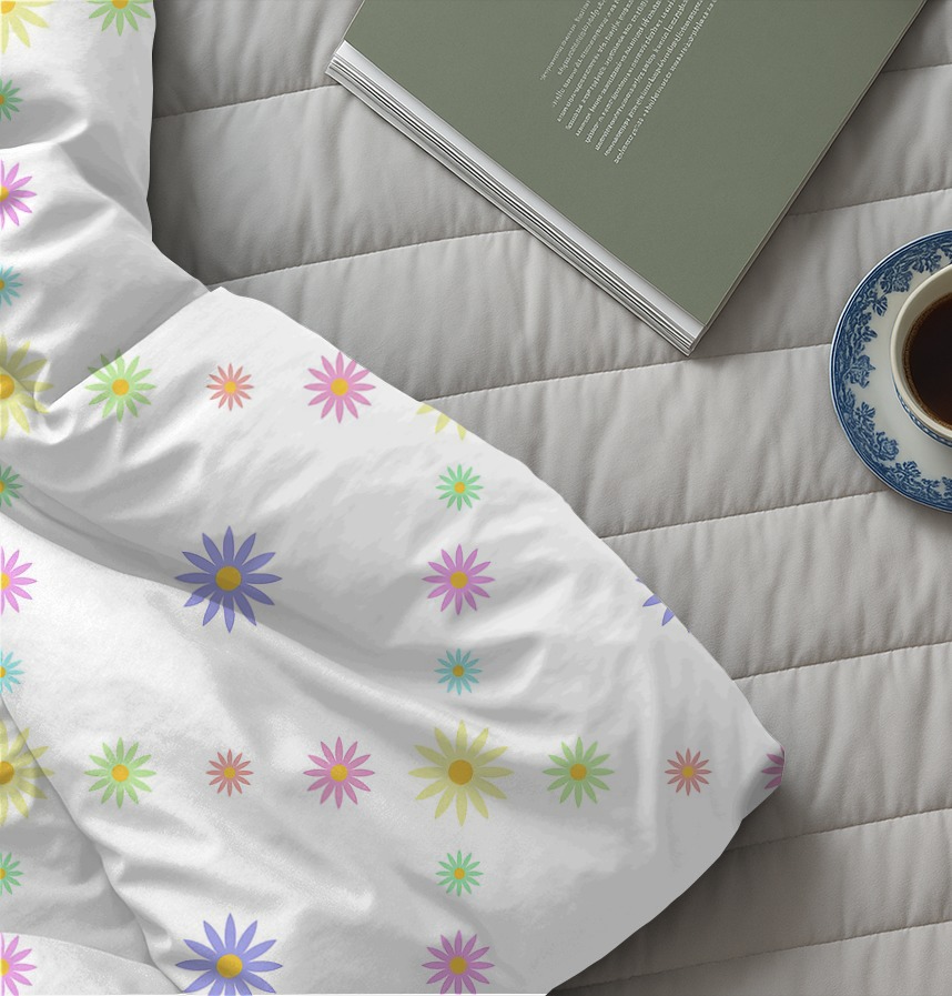 Soft, warm pastel colors are utilized to create a visually comfortable and lovely atmosphere. Daisy-shaped flowers in various colors, including purple, yellow, pink, mint, orange, and sky blue, are harmoniously arranged, each flower expressed in a simplified form, creating a cute and cheerful impression.