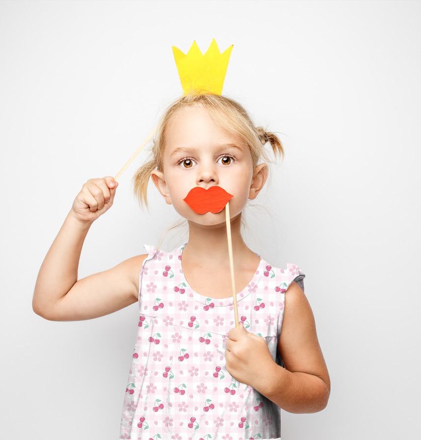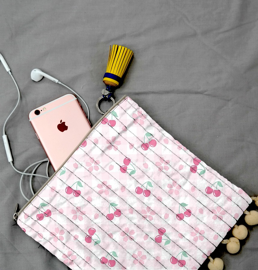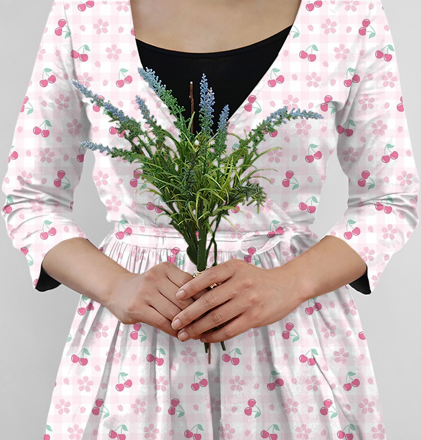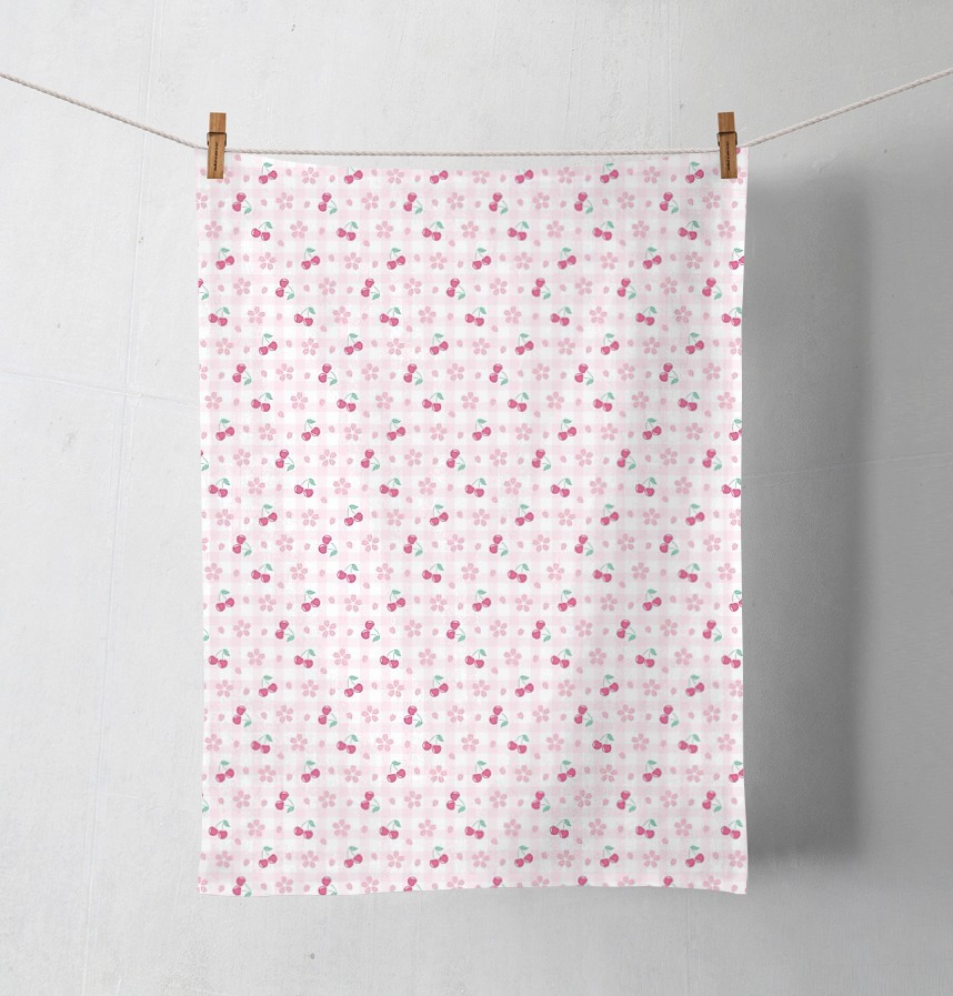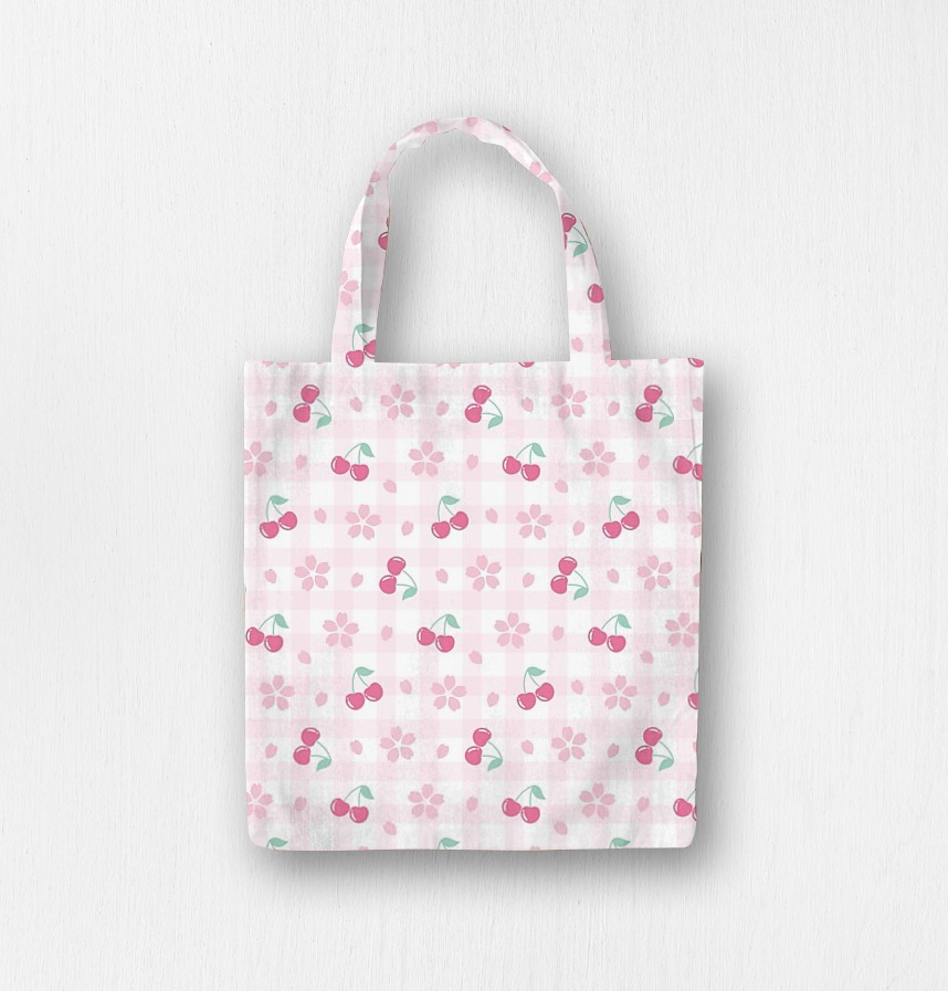 The pattern features cherry blossoms, cherries, and gingham checks.