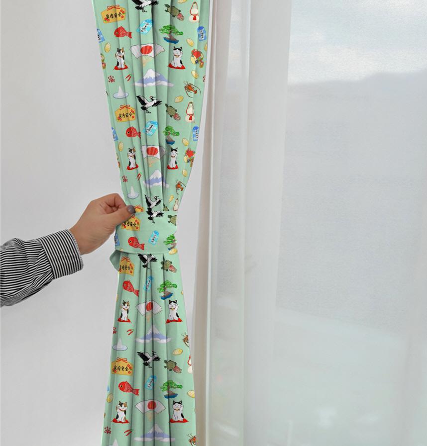 The design features auspicious motifs scattered throughout the design, including the Japanese flag, Mount Fuji, beckoning cat, gourd, crane, turtle, spiny lobster, folding fan, pile of salt, chili pepper, sea bream, pine, charm, votive plaque, magic mallet, gold coin, and azuki beans, all of which are considered lucky charms in Japan.