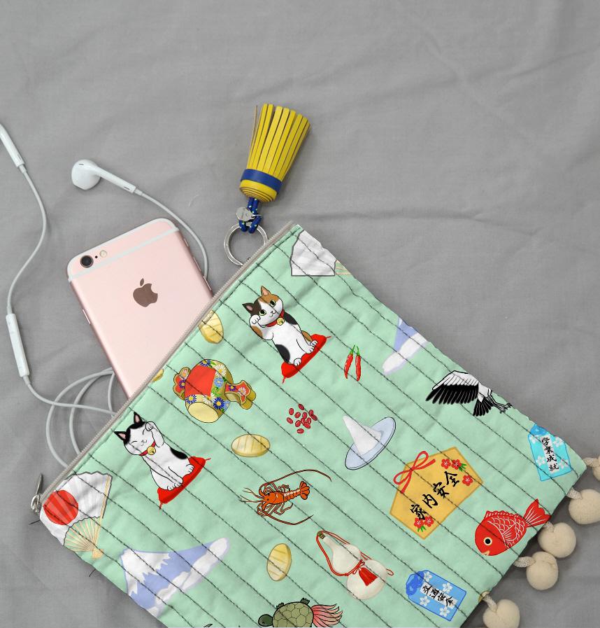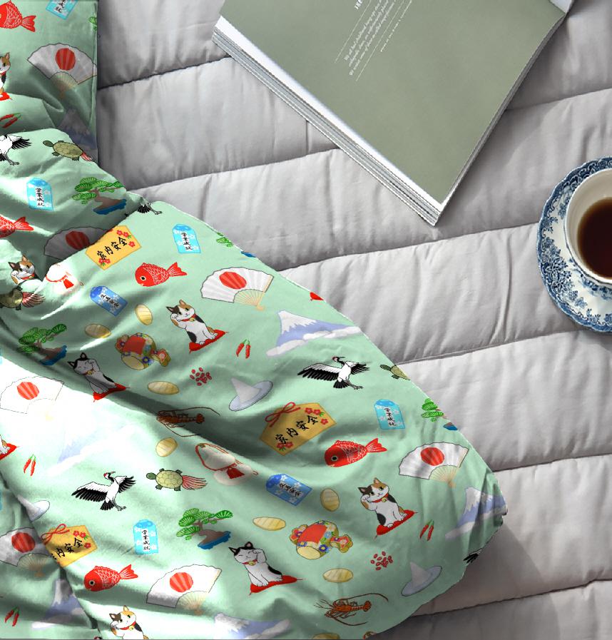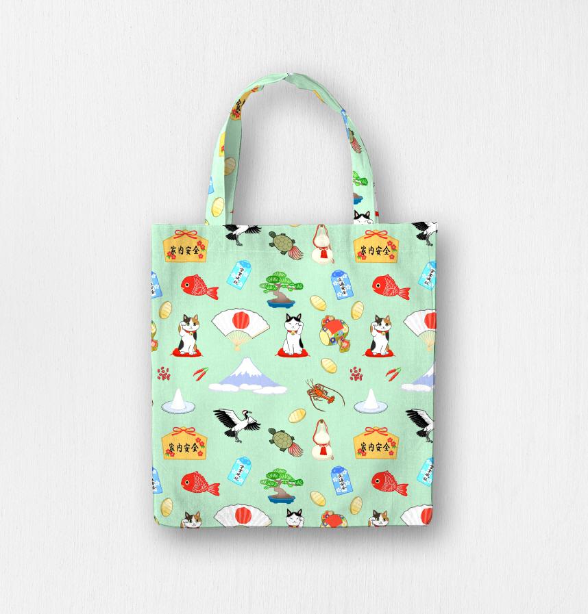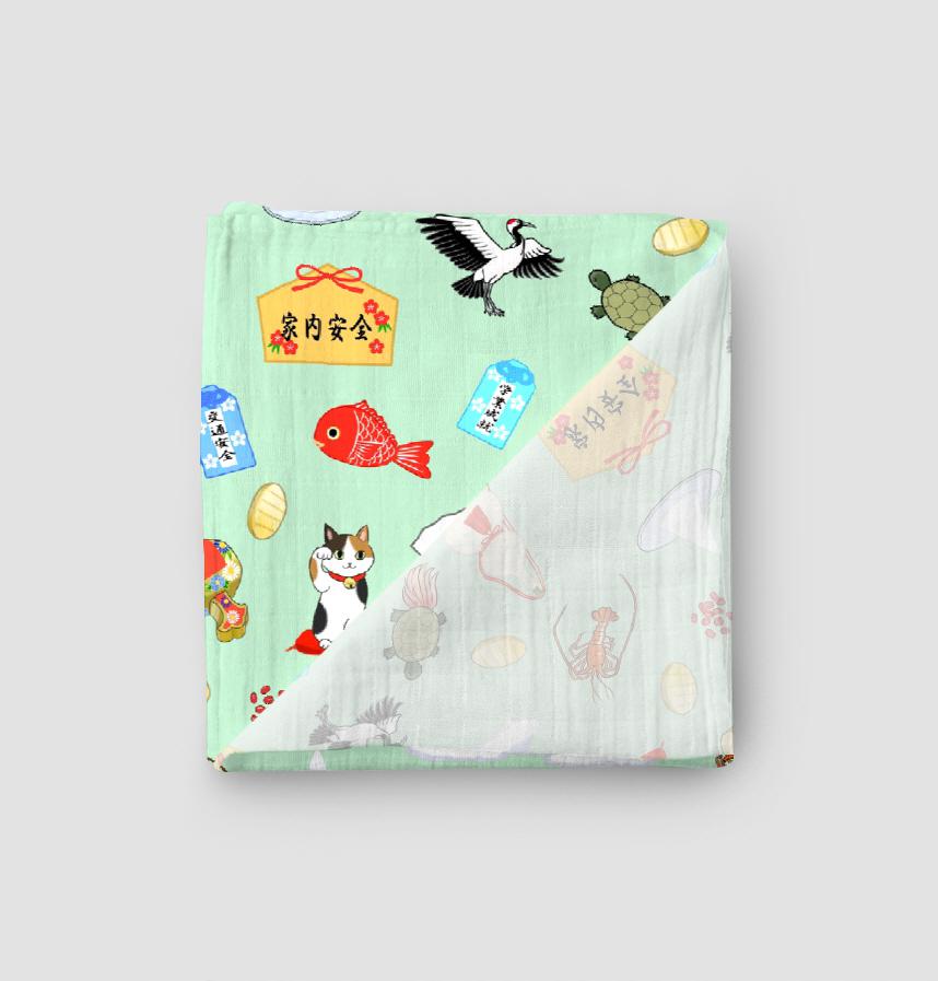 Design infomation We scattered Japanese lucky charms, Hinomaru, Mt. Fuji, maneki-neko, gourd, crane, turtle, lobster, fan, salt in a serving of red pepper and sea bream and pine and amulet and ema and Uchide no Kozuchi and koban and azuki beans.